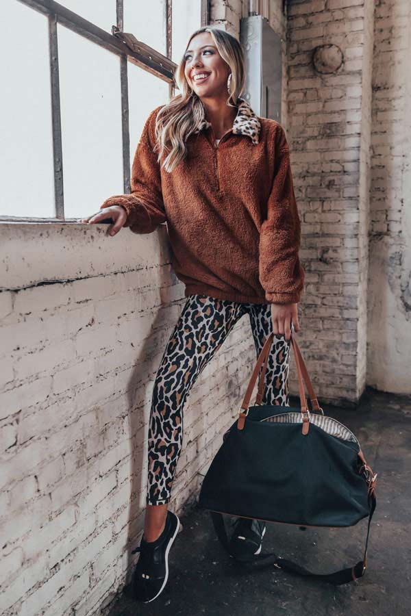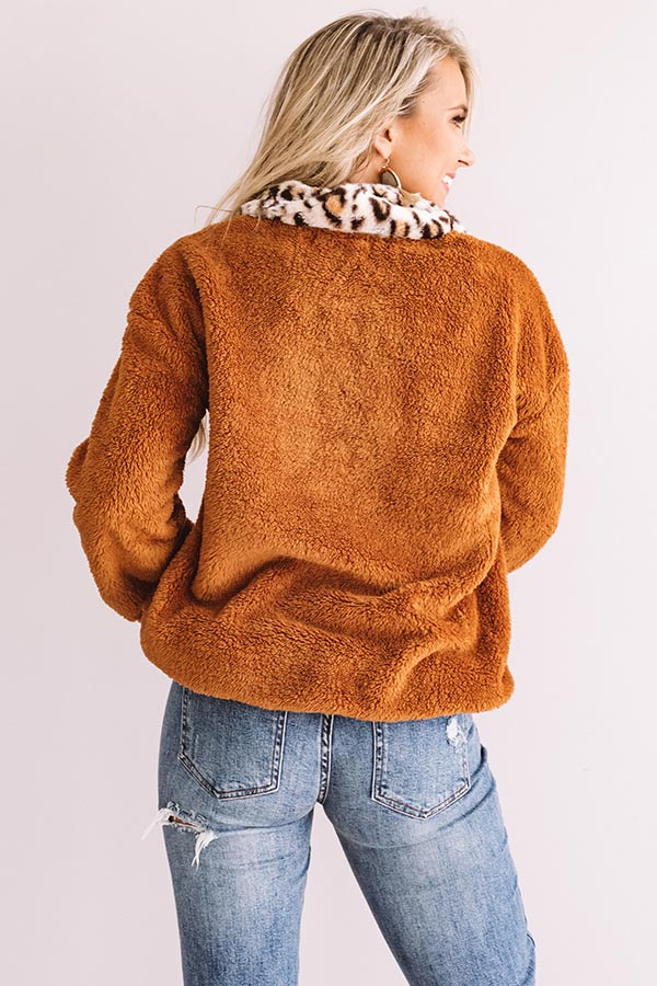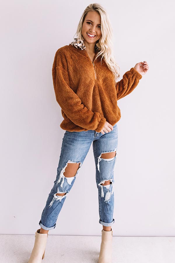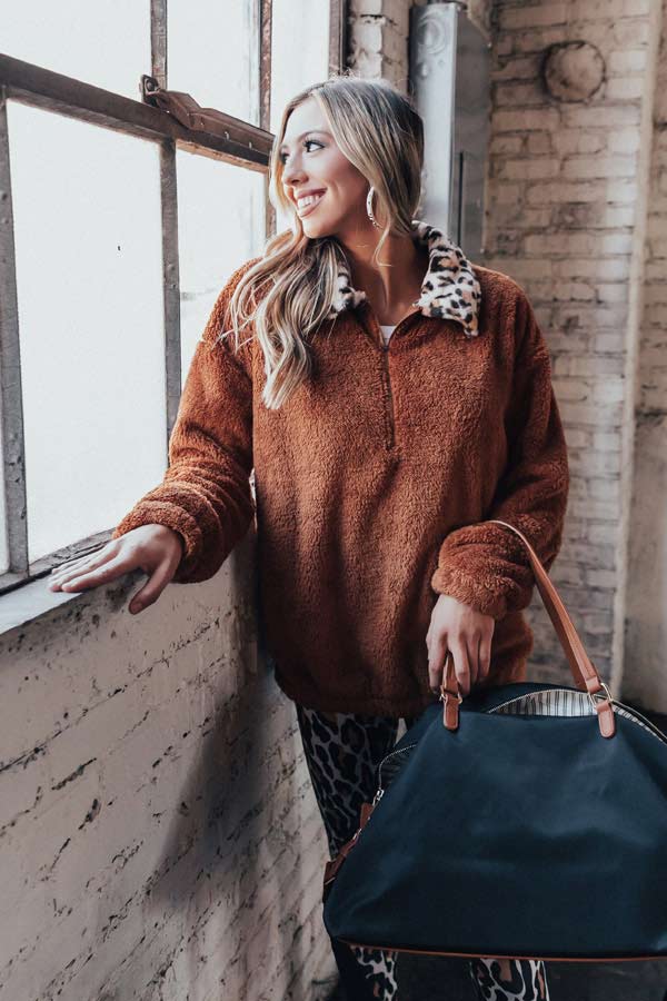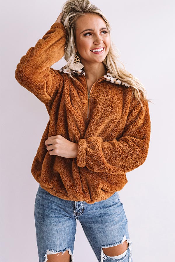 There is no better way to prepare yourself for those 'chilly days ahead' than to treat yourself to this warm and cozy brown pullover! It features ultra soft faux fur material, a zip up bodice with a high leopard print collar, long loose sleeves with fitted elastic banded cuffs, and a slouched bomber style silhouette that falls into a straight cinched hemline!