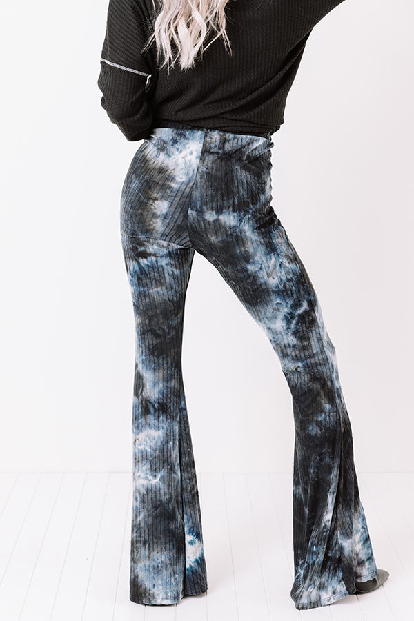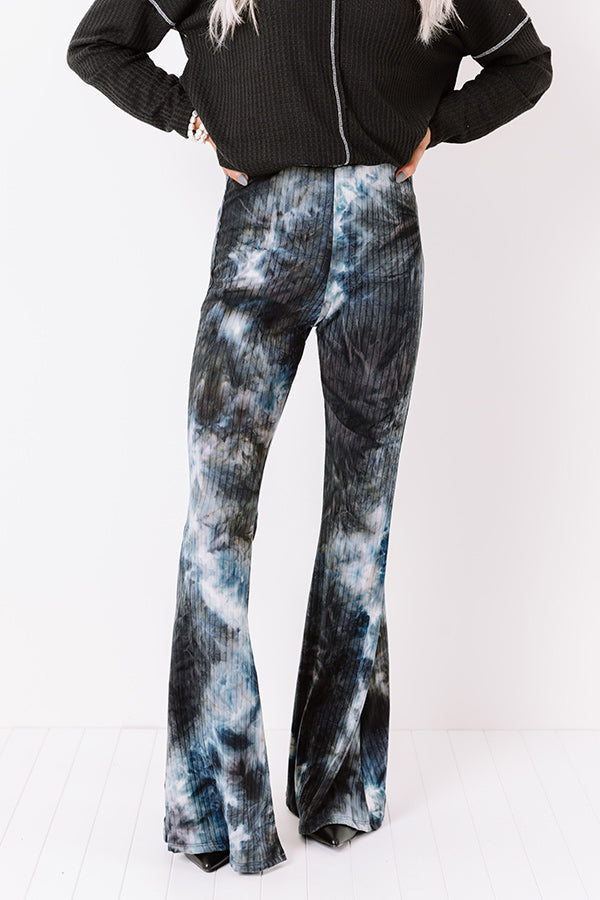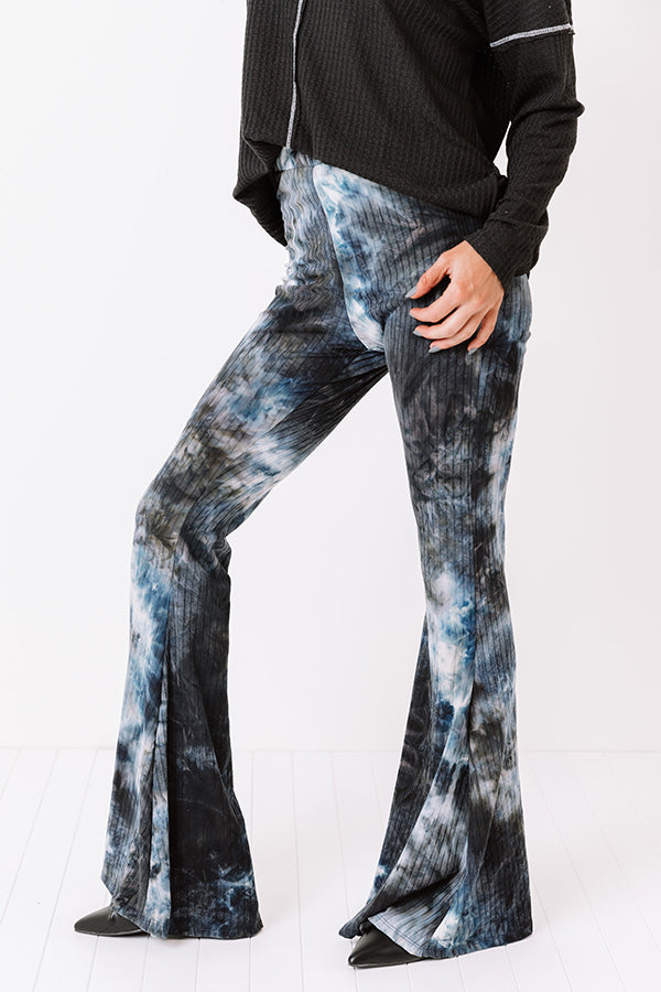Stay groovy in our boho 'Chime In' flare featuring soft and lightweight four-way stretch material with subtle ribbed texturing and dark navy and charcoal hued tie dye, a wide high waistline, and a flattering figure hugging silhouette that falls into trendy flared ankle-length hemlines!