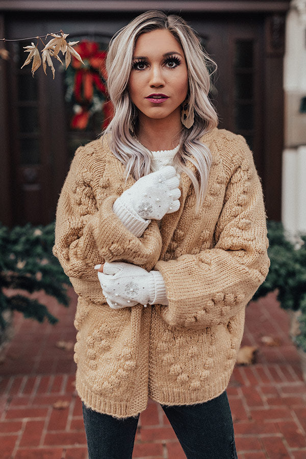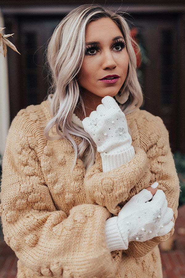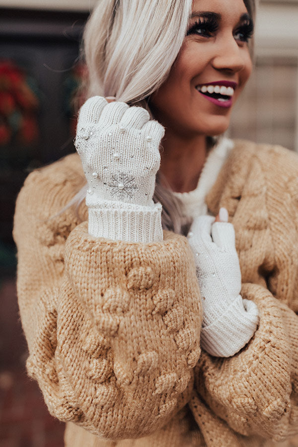 Add an extra accessory of warmth to your OTD with our ivory colored "Christmas Cocoa Gloves" featuring soft lightweight tight knit material with white embroidered snowflake detailing and beaded pearl accents, a half finger fit, and cuffed hemlines!
