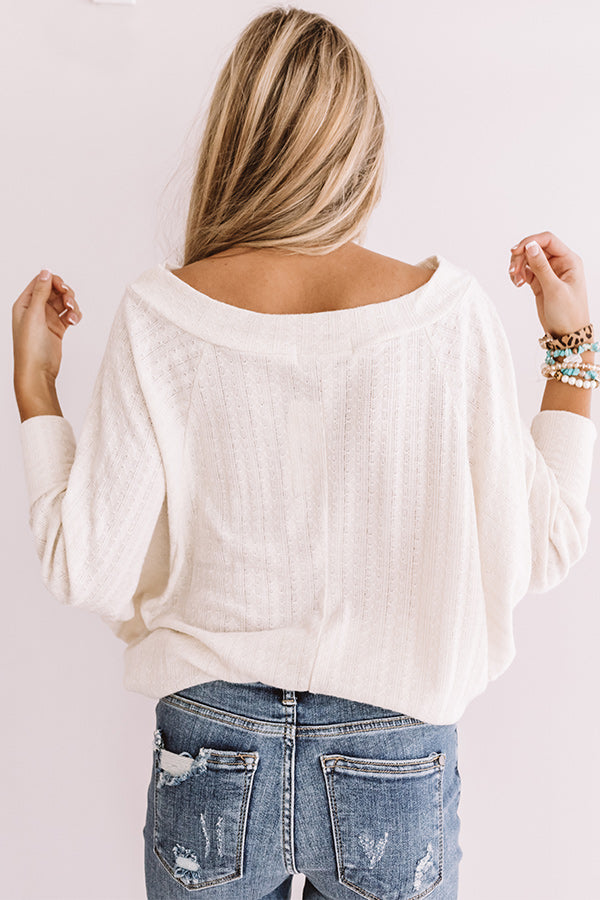 Take on any day in our ivory colored "Cider And Spice" shift top featuring lightweight loose knit material with subtle texturing, a wide v-cut neckline that can be worn off one shoulder, long loose bishop sleeves with fitted cuffs, and a relaxed silhouette that falls into a straight hemline! You can style this basic fall essential with some distressed ankle skinnies and leopard booties, or you can layer it under our "Fallin' For Autumn Fringe Vest in Taupe" with a wine colored skirt, "The Lynn Over The Knee Boot in Warm Taupe," a neutral tote, and our "Epic Adventure Felt Hat in Merlot!" Measurements
