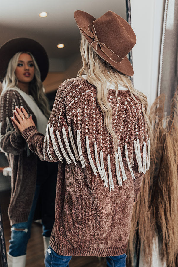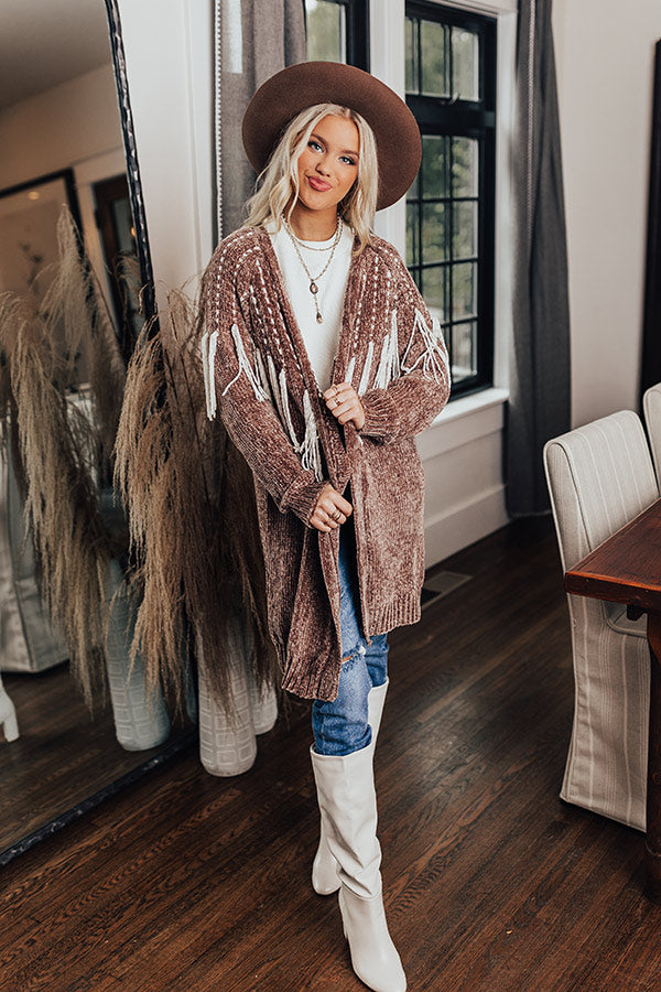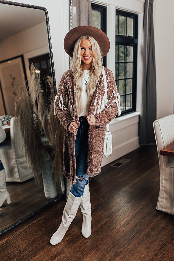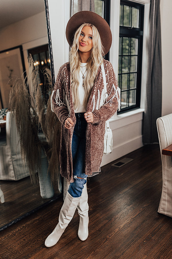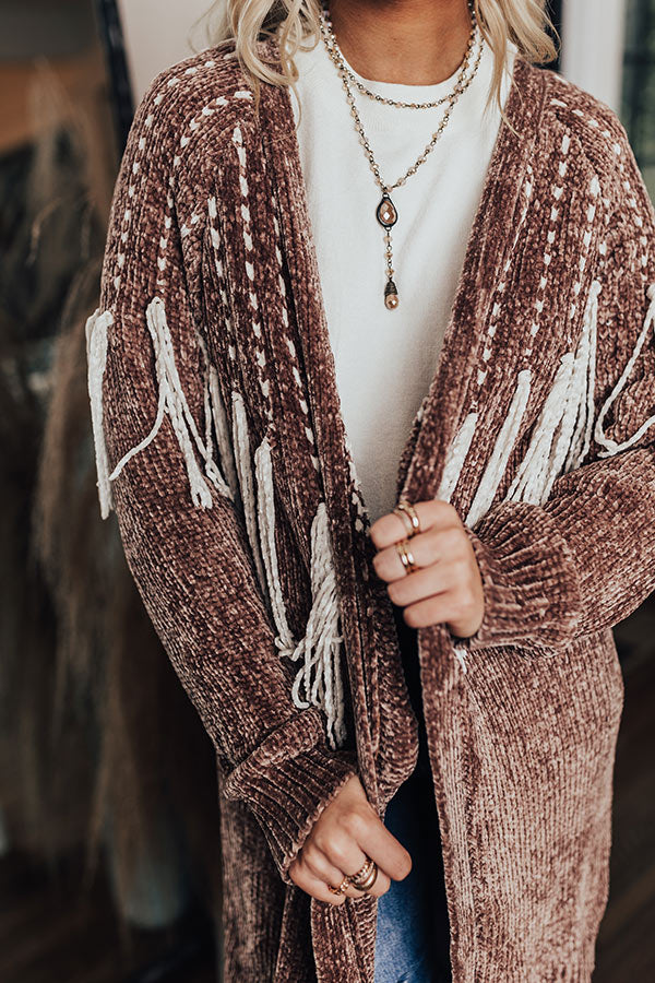 Wrap yourself in style with our adorable mocha colored 'Cider Falls' cardigan featuring soft chenille material with cute white fringe accents, ribbed trim detailing, long loose sleeves, and a draped open front silhouette that falls into a straight mid-thigh length hemline! Measurements