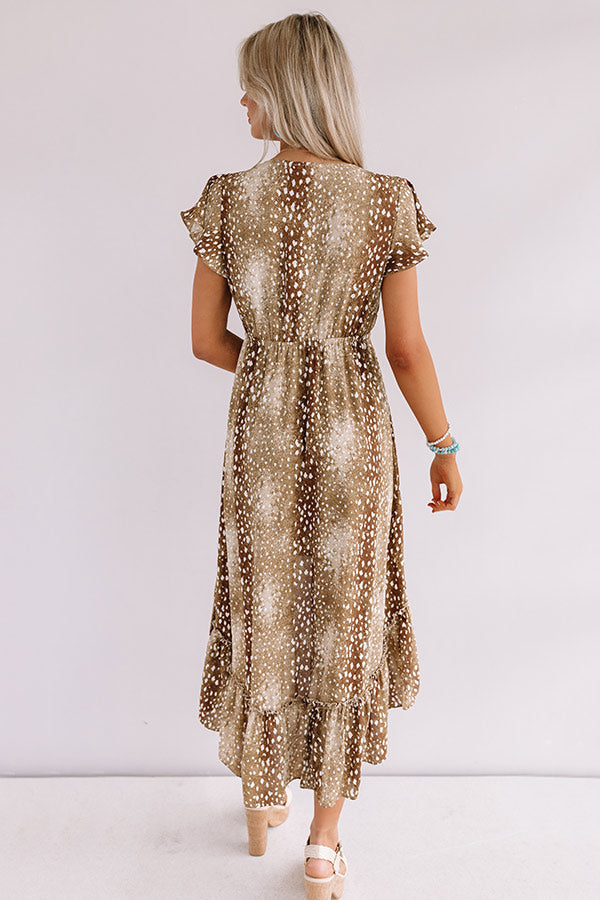 You are sure to love the brown hued "Cider In Aspen" dress featuring an adorable white spotted pattern, a v-cut neckline that ends in a tie front, short flutter sleeves, an fitted elastic waist bodice, lightweight material, and a flowy skirt that falls into a ruffled uneven hem that starts at the knees in the front and cascades to the back of the ankles! This piece can be paired with a neutral heel and woven tote, or you can add a pop of color when you wear it with "The Parker Faux Suede Lace Up Heel in Violet" and our "Shine Your Light Hoop Earrings in Violet!" Measurements