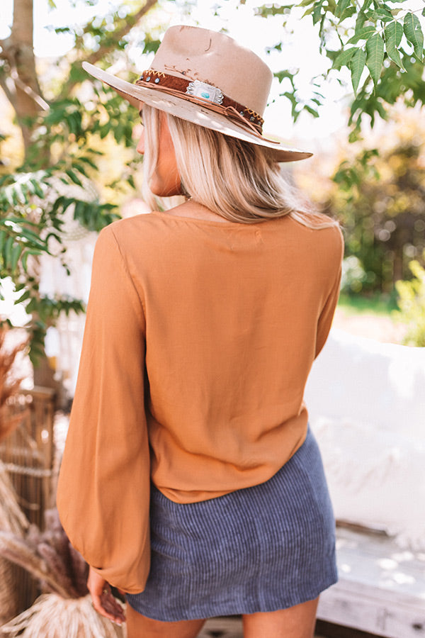 Welcome the fall season in style with our darling copper colored "Cider Sips Top" featuring lightweight material, a v-cut neckline, a cinched up center front detail with a tie closure, long oversized bishop sleeves with elastic banded cuffs, and a figure flattering silhouette that falls into a draped front hemline and a straight back hem! This intricate piece pairs perfectly with a slate corduroy skirt and a matching brown bootie and wool hat, but you can also wear it with some black flares, "The Pryor Faux Leather Peep Toe Bootie in Camel," and our "New On The Block Faux Leather Fringe Tote in Black!" Measurements