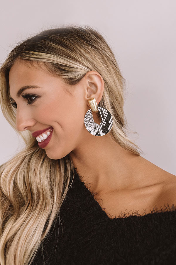 Wow the crowd with our "Cider Smiles" statement earrings featuring thick gold posts with wide black and white snake print hoops!