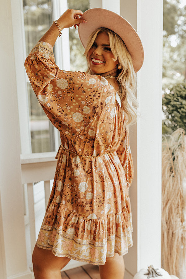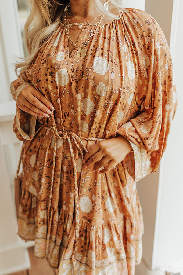 You are sure to look so sweet in this beautiful camel hued plus size shift dress featuring lightweight material patterned with a pretty floral print, loose 3/4-length sleeves, a matching tie belt, and a relaxed silhouette that falls into a straight mid-thigh length hemline!