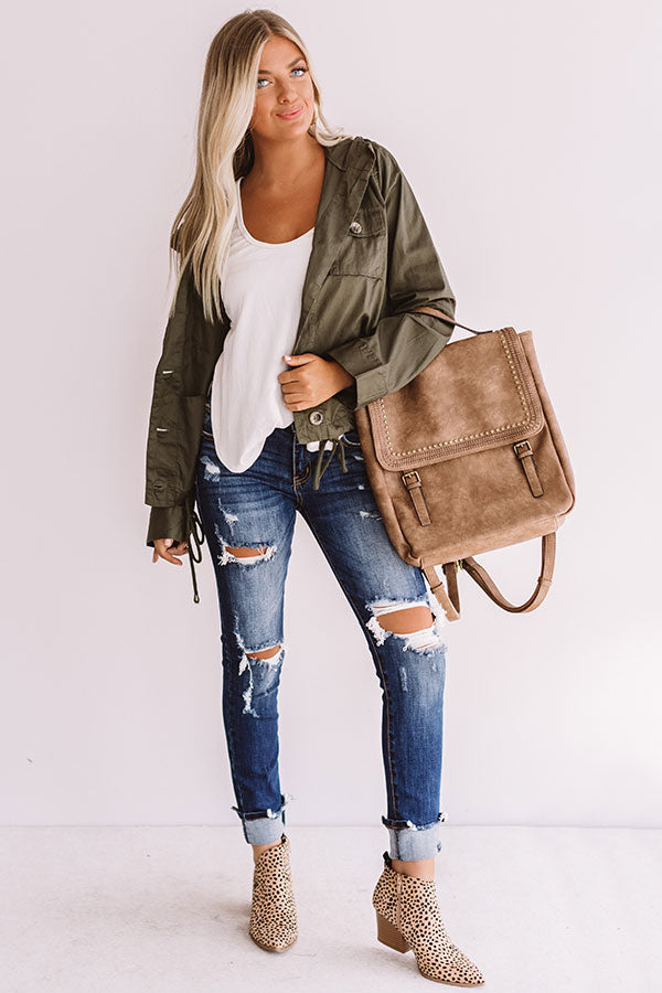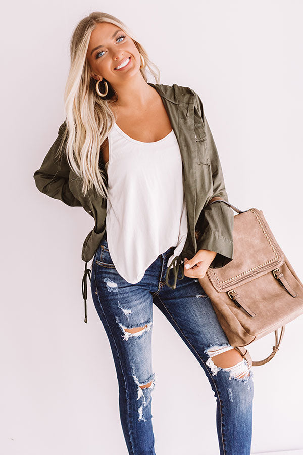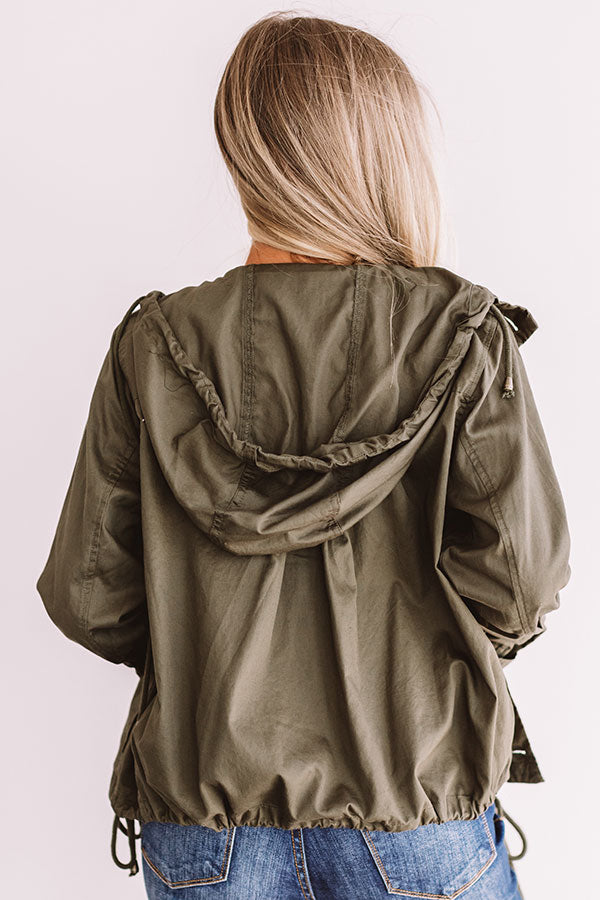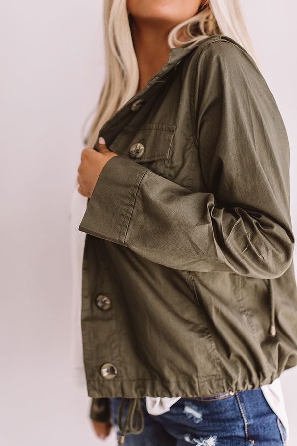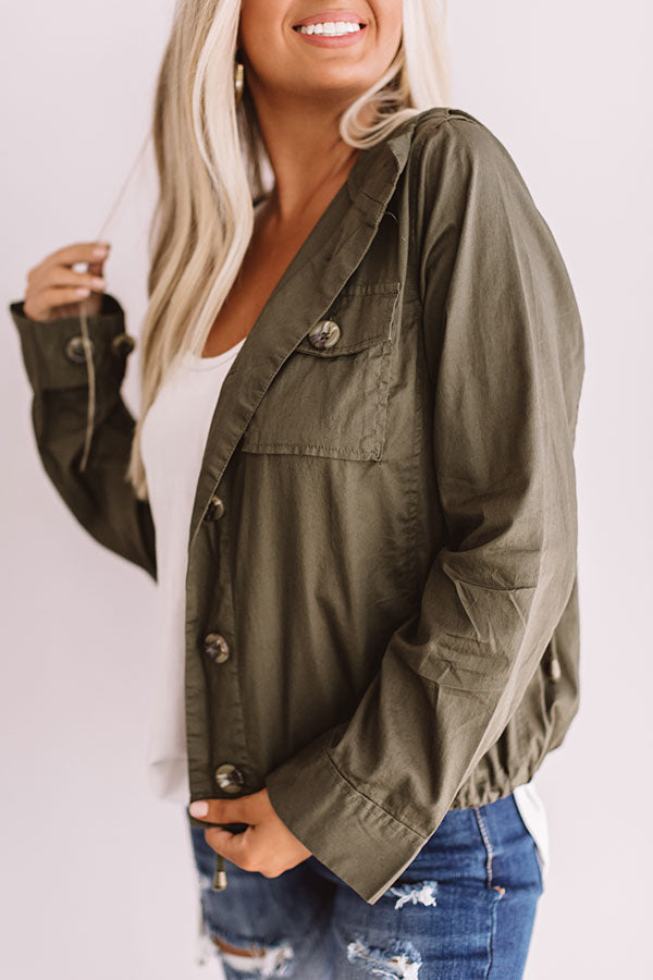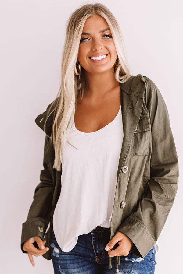 Show off your "Cider Style" in this olive jacket featuring a button up front with large faux marble buttons, a collar with a drawstring hood, four pockets, long sleeves, lightweight material, and a gathered hemline with end ties! The earthy color of this piece provides you with a variety of styling options...like with a simple white top, distressed skinnies, leopard booties, and a backpack, or with a basic grey tank, black flares, and "The Seraphina Faux Leather Wedge in Grey" for multiple fall looks! Measurements