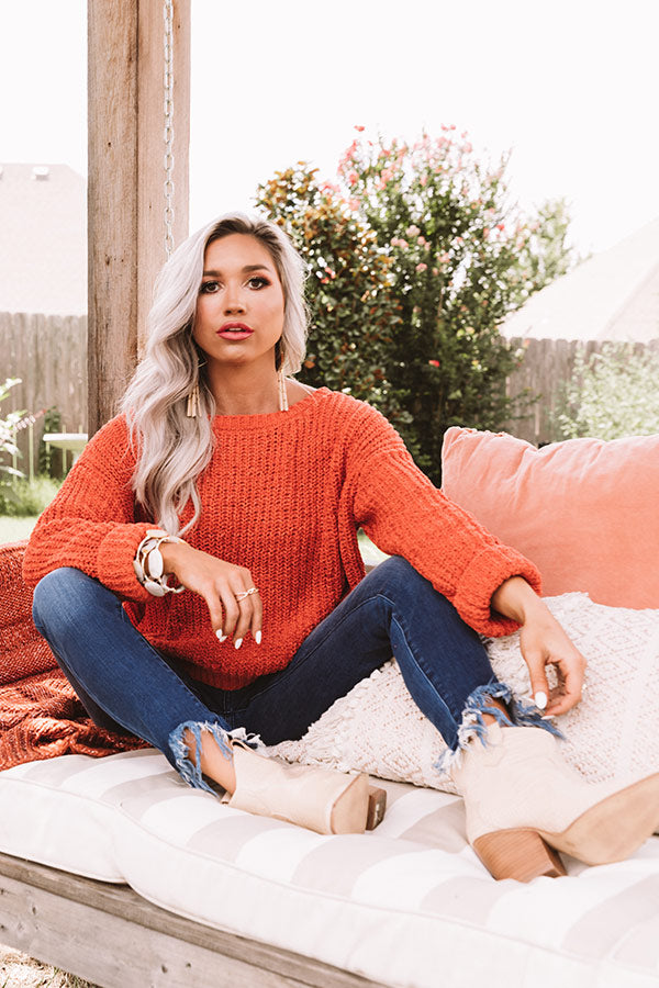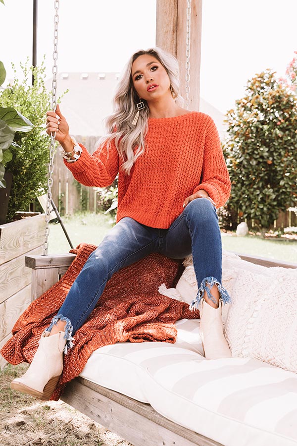 Stay warm this fall in our festive tangerine colored "Cinnamon Spice" sweater featuring ultra soft lightweight tight knit chenille material with ribbed texturing, a high rounded neckline, long loose sleeves with cuffs that can be rolled, and a relaxed silhouette that falls into a straight hemline! We have styled this fall essential with some frayed dark wash skinnies and neutral peep toe booties, but you can also wear it with our "Wine Cellar Corduroy Skirt in Birch," "The Franco Perforated Bootie in Brown," our "Floating On Cloud Nine Fedora in Birch," and our "Sense Of Style Woven Bag in Brown!" Measurements