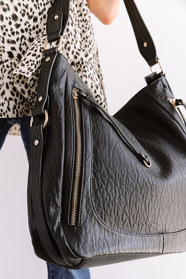 You are sure to look "city chic" when you accessorize with this sleek black tote featuring lightweight faux leather material, a single 1-inch strap, two outside accent zippers, an additional back pocket, and a spacious square shaped pouch!