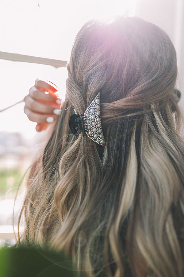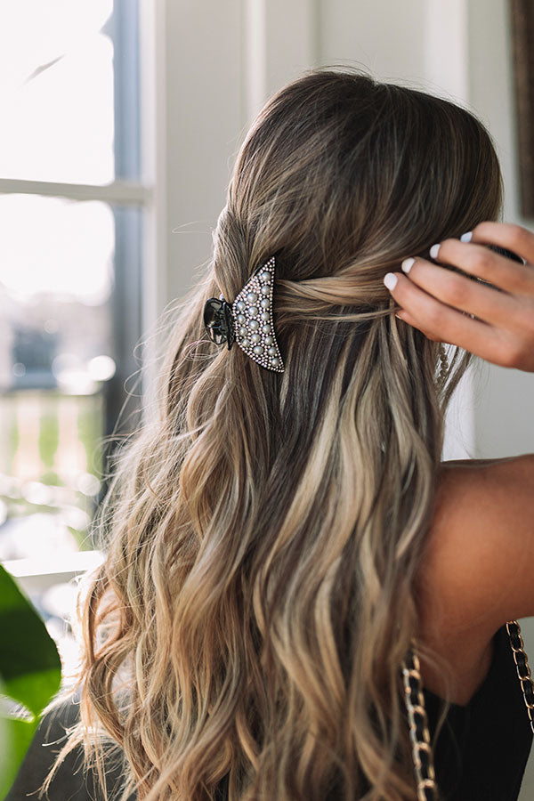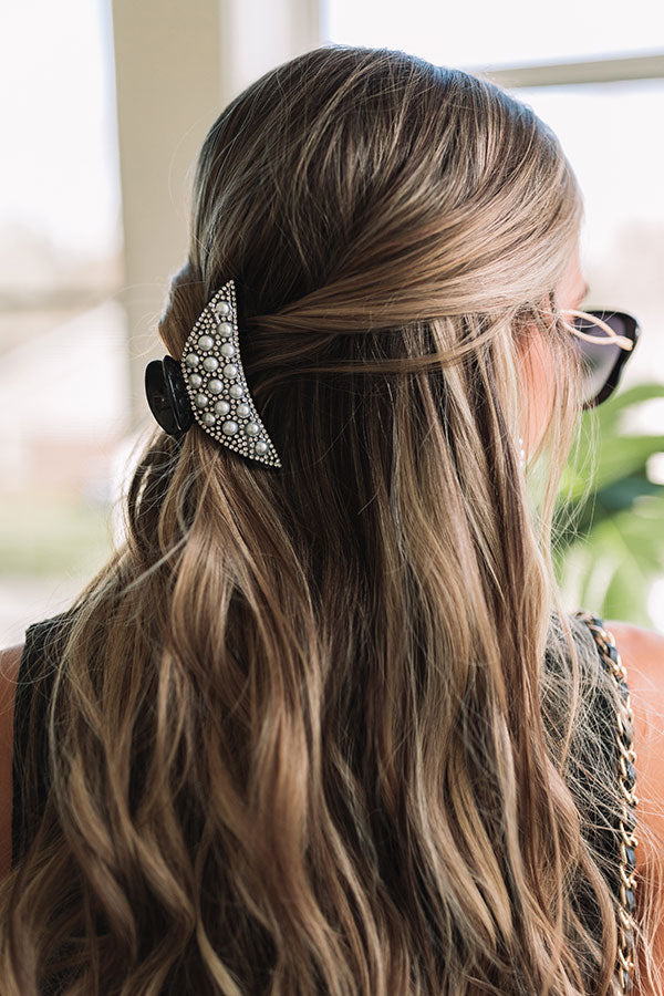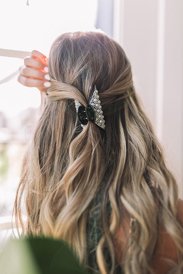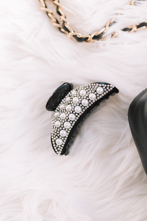 Your hair is sure to shine bright when you style it with our eye-catching black 'City In Italy Hair Claw' featuring shimmering rhinestone and pearl accents!
