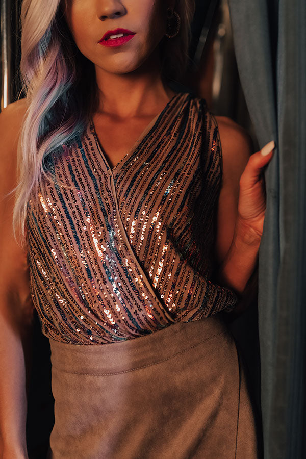 Let your "light shine" in this adorable rose gold hued bodysuit featuring lightweight material covered in subtle colorful sequins, a wrapped bodice with a v-cut neckline, wide shoulder straps, a low open back with a tie string closure, and a relaxed silhouette that falls into a cheeky fit with a two snap button closure! You can style this piece under any type of bottoms and wear any type of outerwear with it for a variety of looks that will carry you from season to season! Measurements