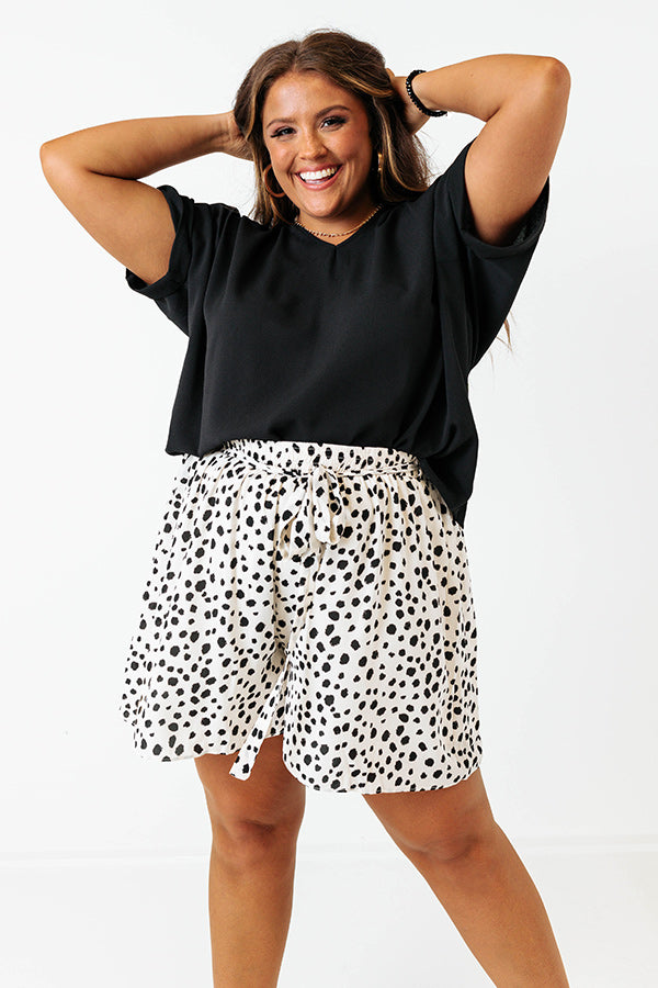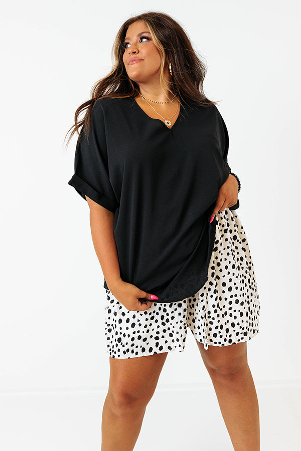 Make the street your runway in our simple but stylish black plus size 'City Meetup Shift Top' featuring lightweight material, v-cut neckline, loose short sleeves with rolled cuffs, and a slouched silhouette that falls into a rounded hemline!