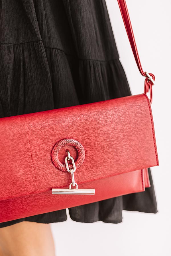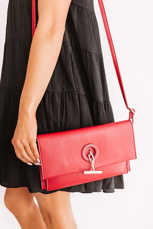 Stay stylish during those nights in the city with this crimson clutch featuring a faux leather material, a zippered inner pouch and an open inner pocket, a fully lined interior, and a flap closure with two snaps and an additional snake print and bar accent! PLUS, it includes a removable and adjustable crossbody strap!