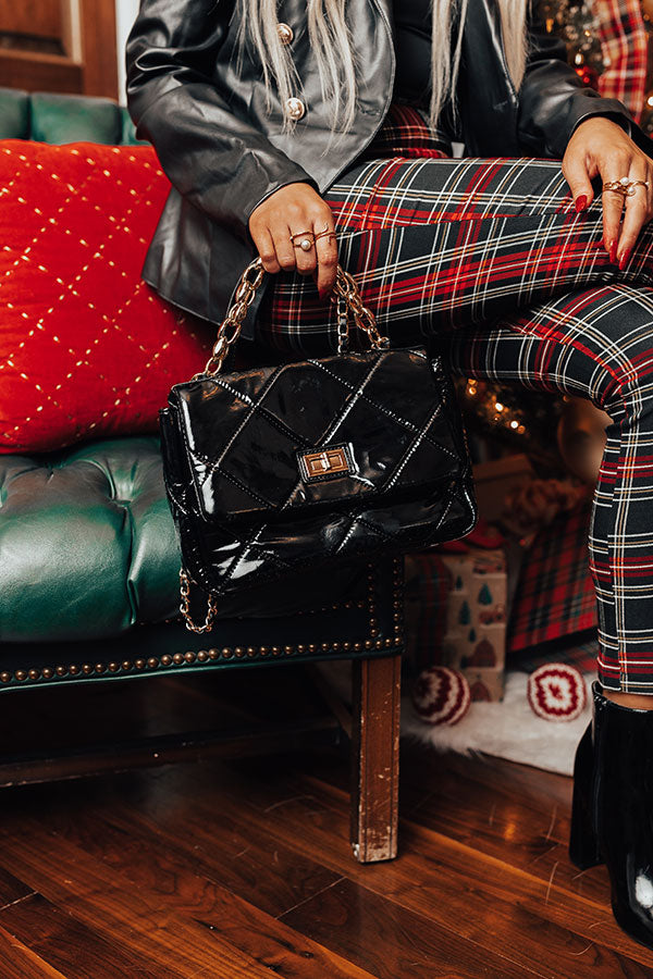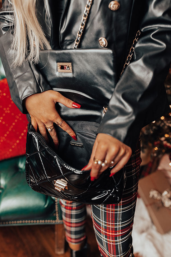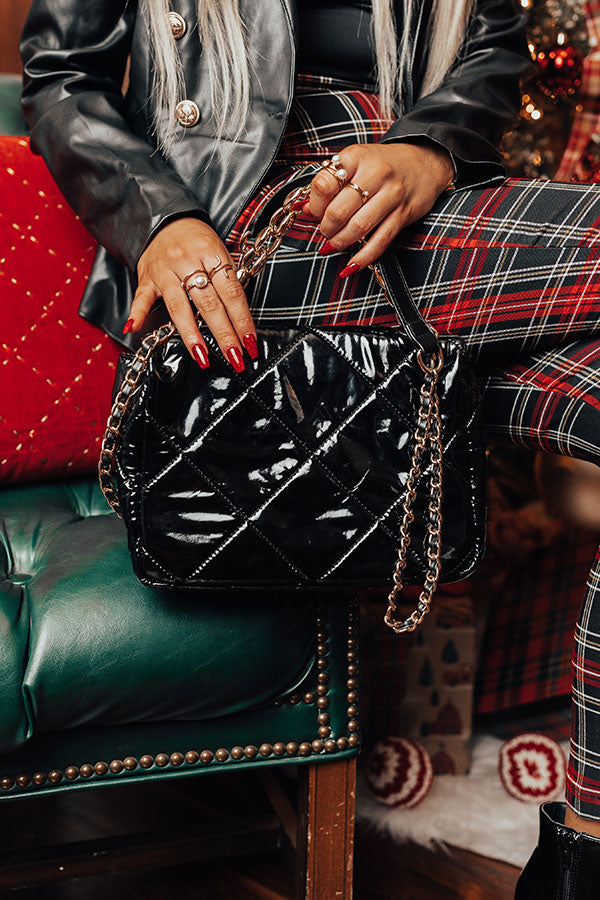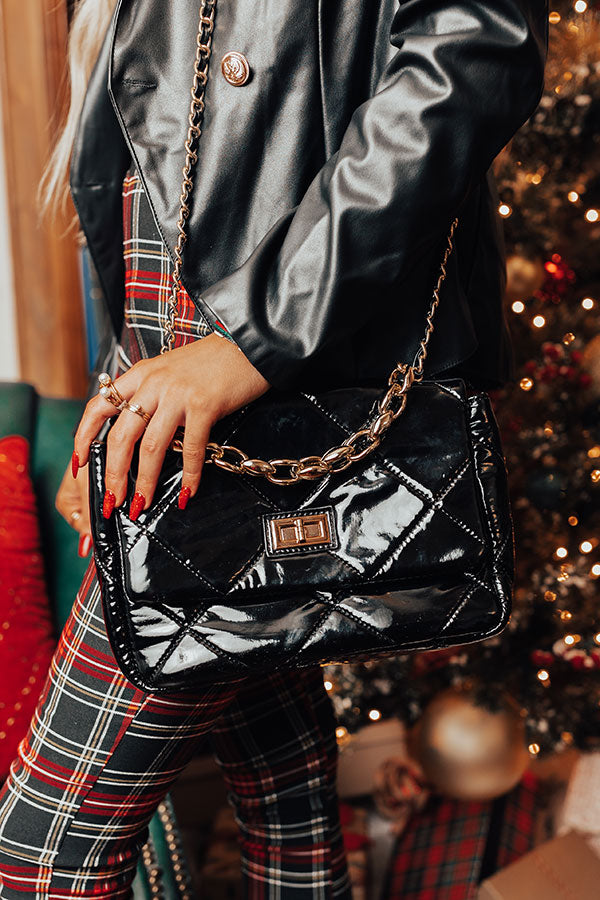 People are sure to envy your style when you carry our luxe black 'City On Speed Dial' crossbody featuring sleek patent material with quilted texturing, a flap closure with gold twist hardware, a gold chain handle, a smaller chain link shoulder strap, and a spacious fully lined interior with an additional zip closure pocket!