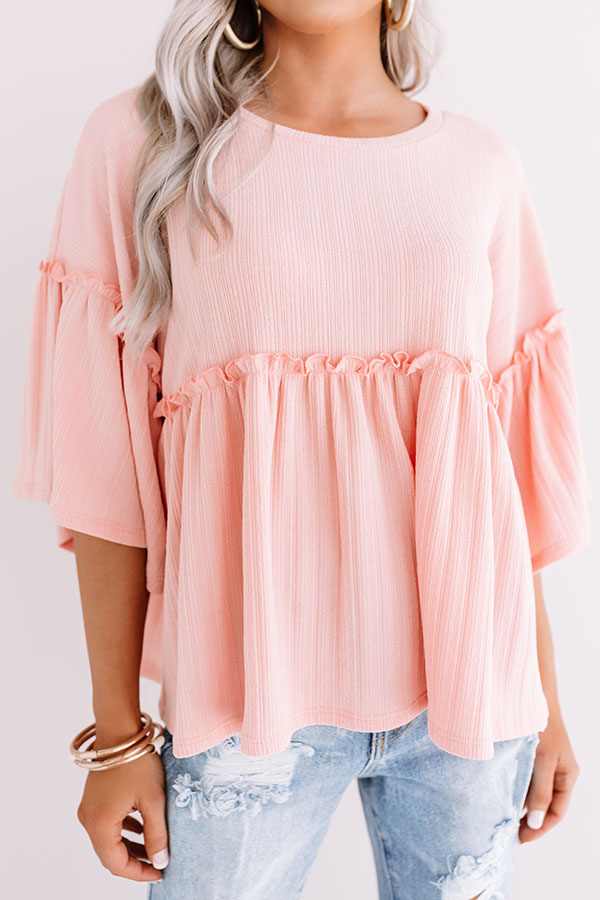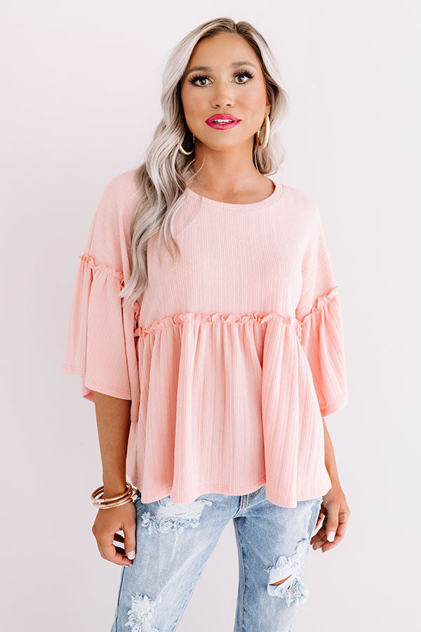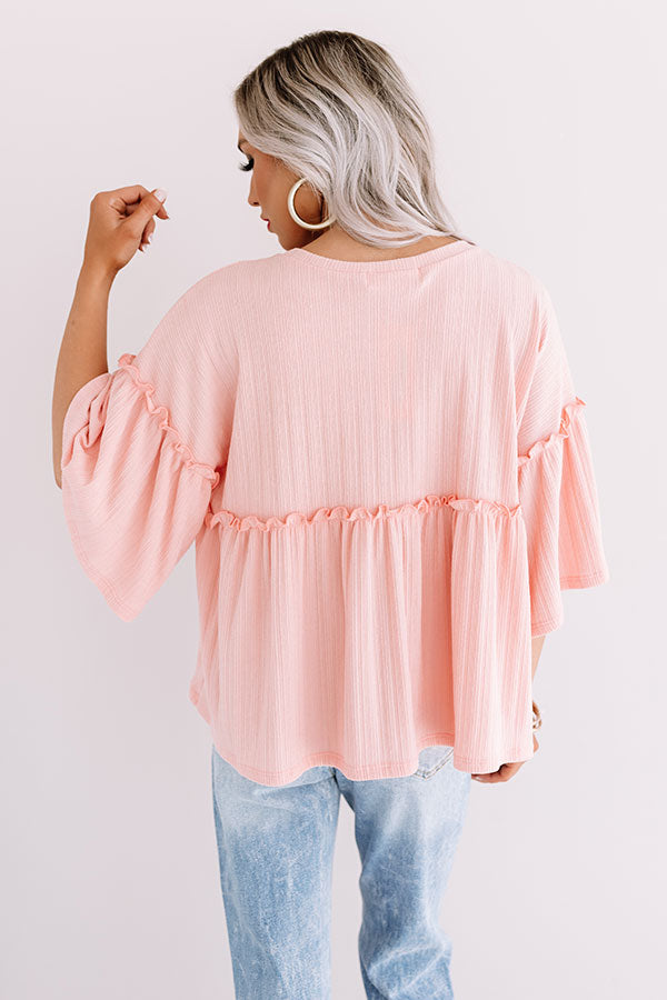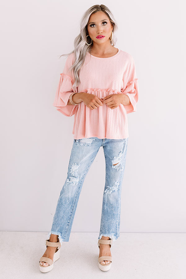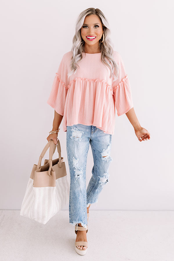Your wardrobe couldn't be better with our chic blush colored "City Skies" top featuring lightweight breezy material, a high rounded neckline, oversized half sleeves with flared cuffs, an exposed ruffle accent seam, and a relaxed babydoll silhouette that falls into an uneven hemline! You can style this cutie a variety of ways, like with some distressed ankle skinnies and a neutral wedge and canvas tote, but you can also wear it with some frayed white shorts, "The Mara Sandal in Pink," and our "Sunkissed Raffia Pearl Visor in Tan!" Measurements