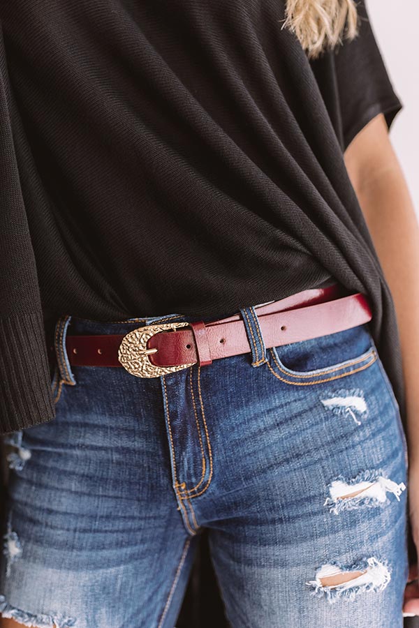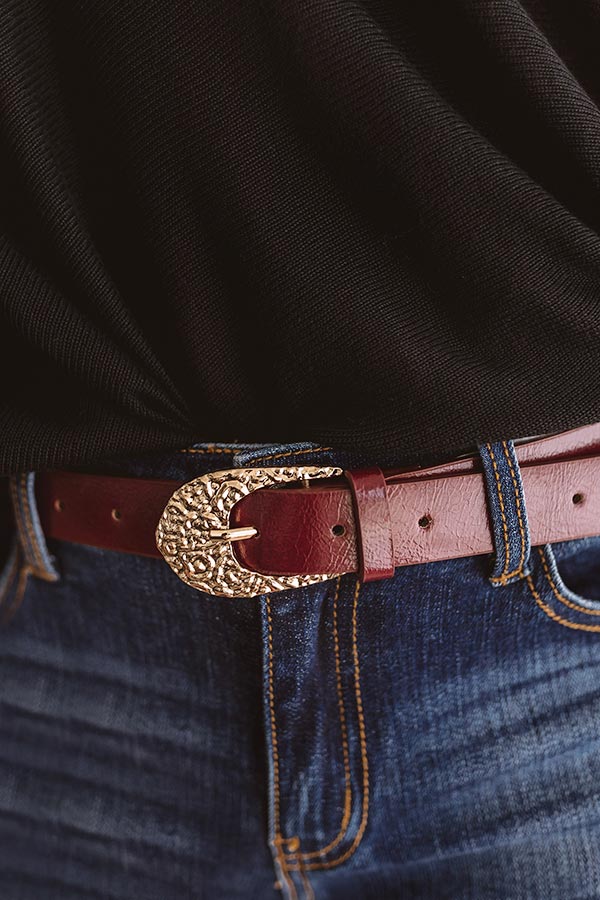 Add a sleek flare to your OOTD with this dark red belt featuring a thin faux leather band and a textured rounded gold buckle!