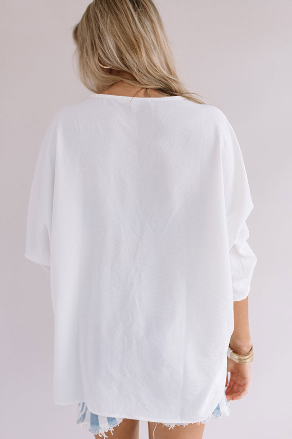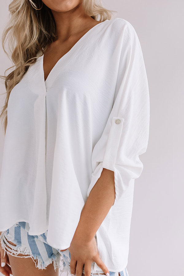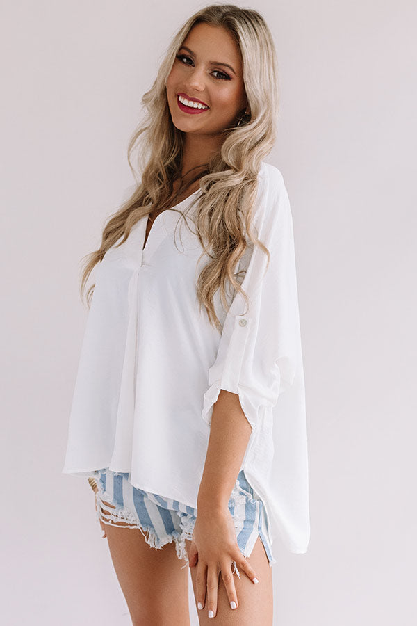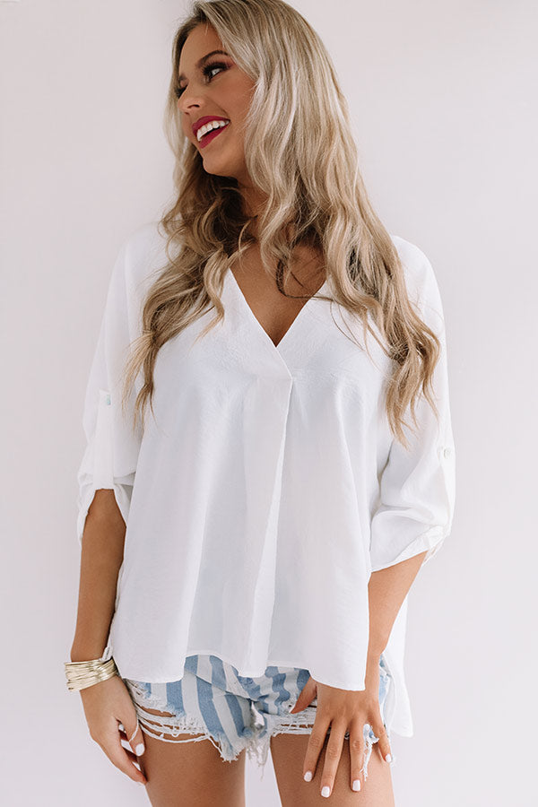 You will without a doubt look "city sleek" when you wear this adorable white shift top featuring ultra soft lightweight material, a v-cut neckline, loose 3/4-length roll tab sleeves, and a relaxed silhouette that falls into a straight high/low hemline with side slit accents! We have styled this classy piece with some distressed striped shorts, a neutral heel, and a straw tote, but you can also wear it with some charcoal flares, "The Seraphina Faux Leather Wedge in Grey," and our "All Caught Up Headband in Grey!" Measurements