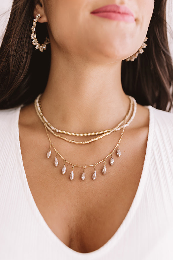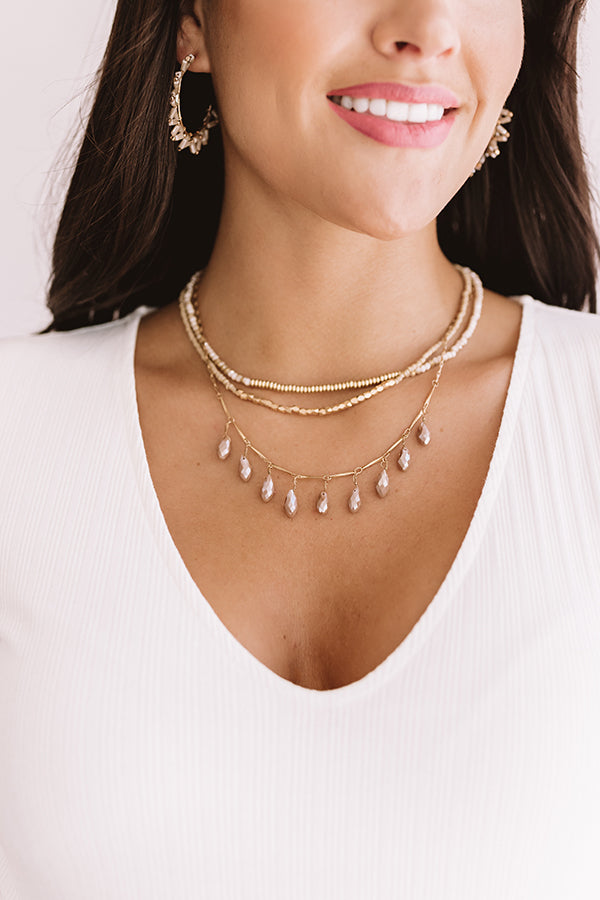 Leave a little sparkle wherever you go with the "City Sparkles" statement necklace featuring three dainty layered chains with gold and birch hued beads and dangling faux gemstone charms!