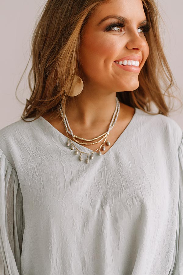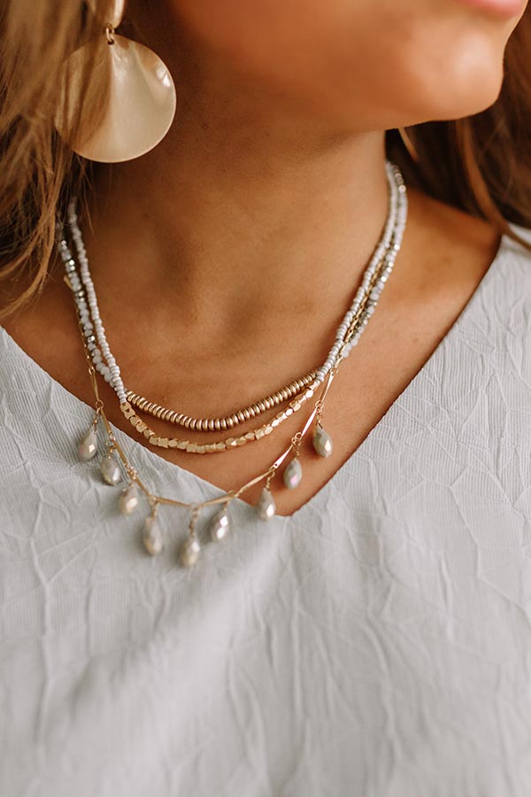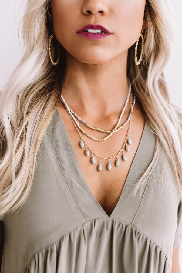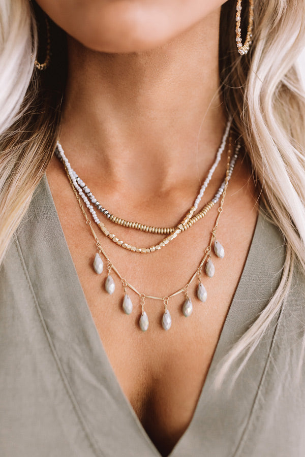 Leave a little sparkle wherever you go with the "City Sparkles" statement necklace featuring three dainty layered chains with gold and grey hued beads and dangling faux gemstone charms!
