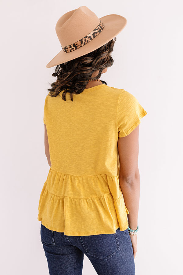 Upgrade your street style with our casual cute marigold colored "City Square Shift Top" featuring soft lightweight material, a high rounded neckline, short loose sleeves, and a relaxed silhouette that falls into a tiered peplum bottom with an uneven hemline! This simple but significant piece styles perfectly with some dark wash flares and a brown heel, faux leather hat, and bucket bag, but you can also wear it with some distressed white shorts and our matching "Kamryn Stripe Sandal in Primrose Yellow!" Measurements