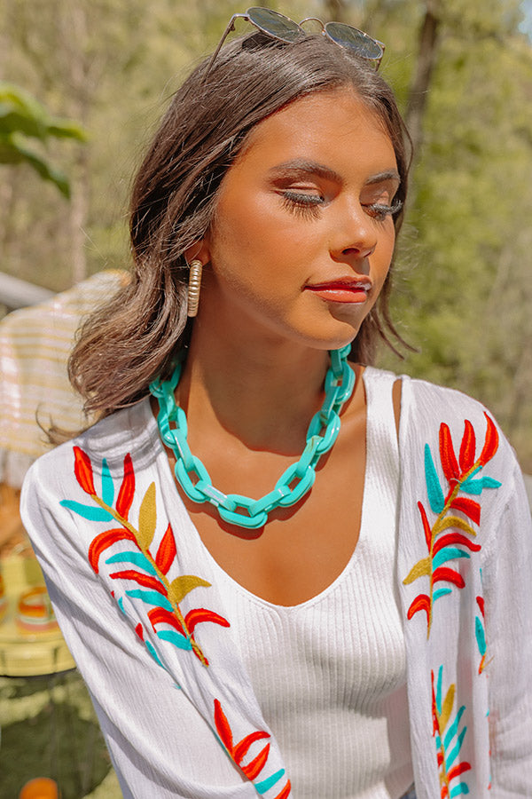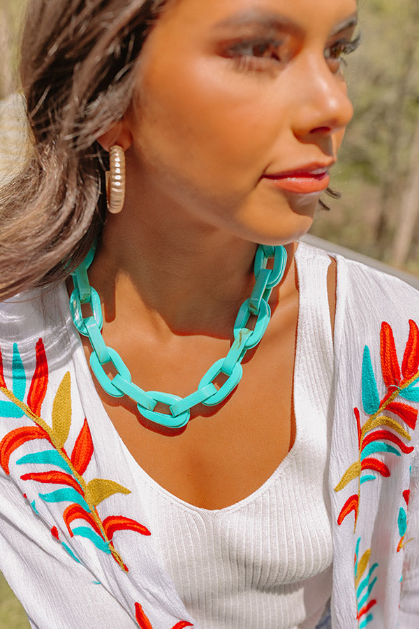 Make the city your runway with this statement accessory featuring an oversized turquoise chain link necklace!