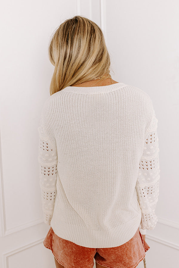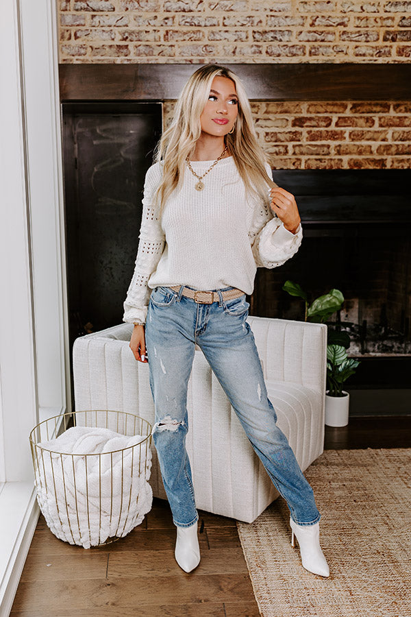 - Long, loose, textured sleeves with scalloped accents and ribbed cuffs