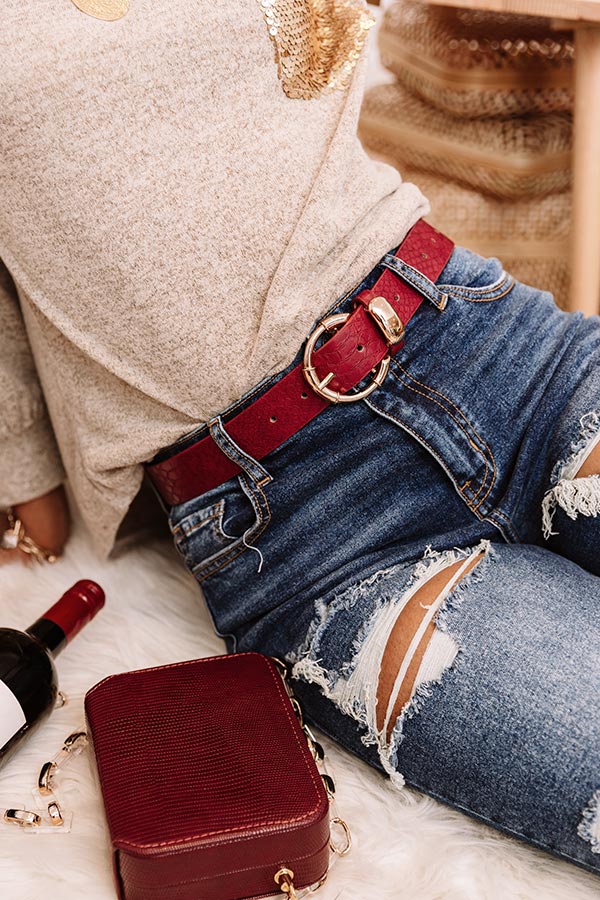 We have no doubt you will have a classic crush on this chic belt featuring a wine colored strap with animal print texturing and gold hardware!