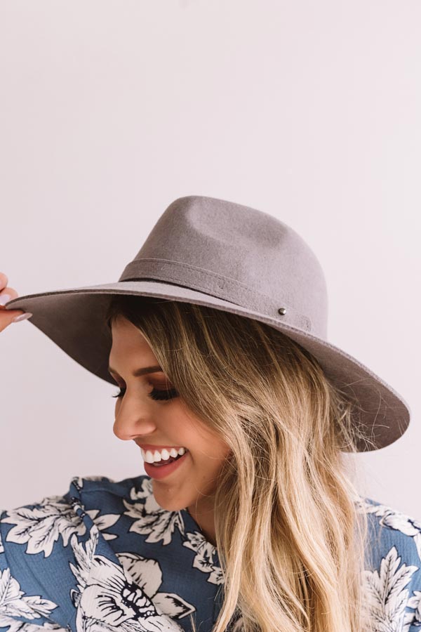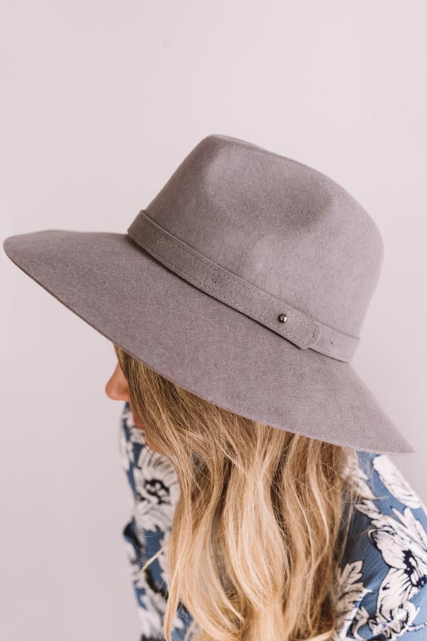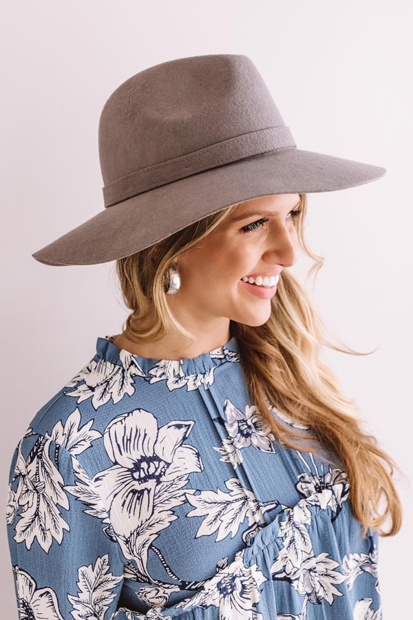 It will be a "classic moment" when you wear this grey hat featuring soft wool material, a wide brim, and an accent strap!