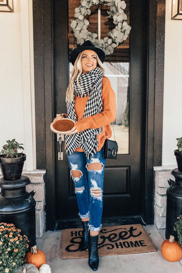 You won't find a more "classic style" scarf than this adorable piece featuring soft loose knit material, a black and white houndstooth pattern, and fringe trim detailing!