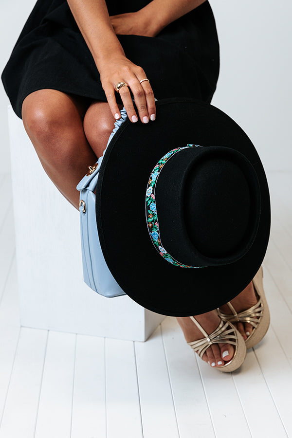 Add a classic touch to your OOTD with this timeless black hat featuring lightweight wool material, a stiff 3.5-inch brim, and a wide vibrant green, pink, and green floral print accent band!