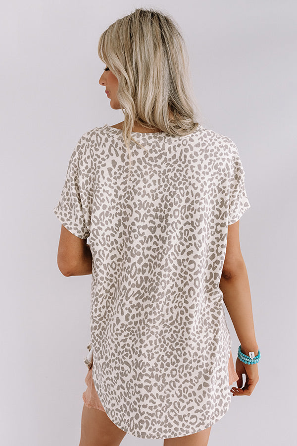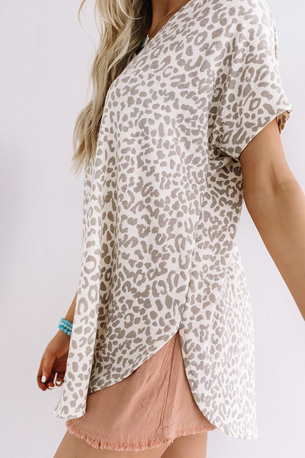 You won't have to start with a "clean fashion slate" after you wear this fierce top featuring soft lightweight material patterned with a neutral and white leopard print, a v-cut neckline, short loose sleeves, and a relaxed silhouette that falls into a rounded hemline with v-notched sides! We have styled this cutie with some trendy shorts, matching wedges, and a crossbody, but you can also wear it with some distressed ankle skinnies, our "Chic Islander Sunnies in Clear," and "The Avonlea Espadrille in Clear!" Measurements