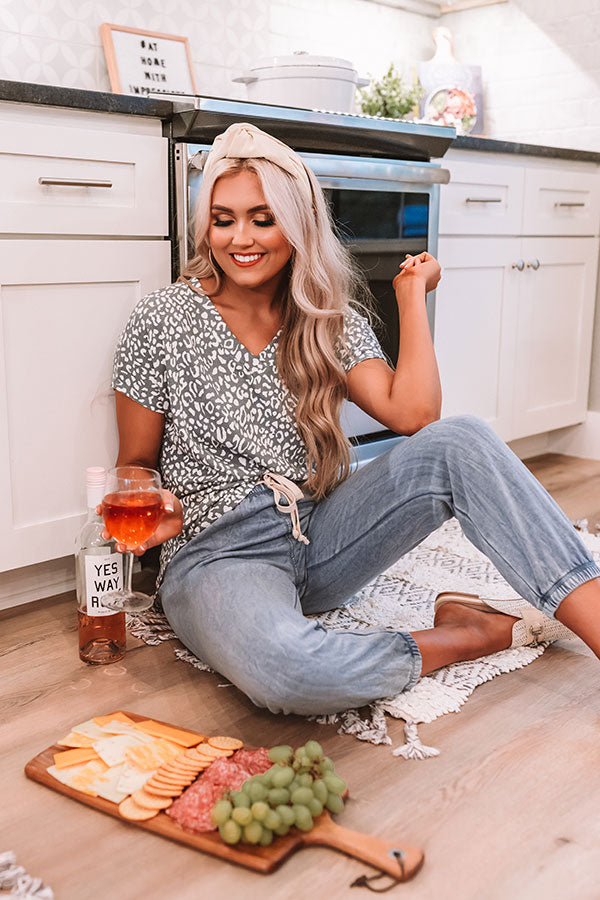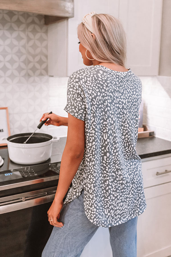 You won't have to start with a "clean fashion slate" after you wear this fierce top featuring soft lightweight material patterned with a grey and white leopard print, a v-cut neckline, short loose sleeves, and a relaxed silhouette that falls into a rounded hemline with v-notched sides! We have styled this cutie with some trendy joggers, woven flats, and a neutral headband, but you can also wear it with some distressed white shorts, "The Avonlea Espadrille in Clear," and our "Game Day Glam Transparent Bag!"