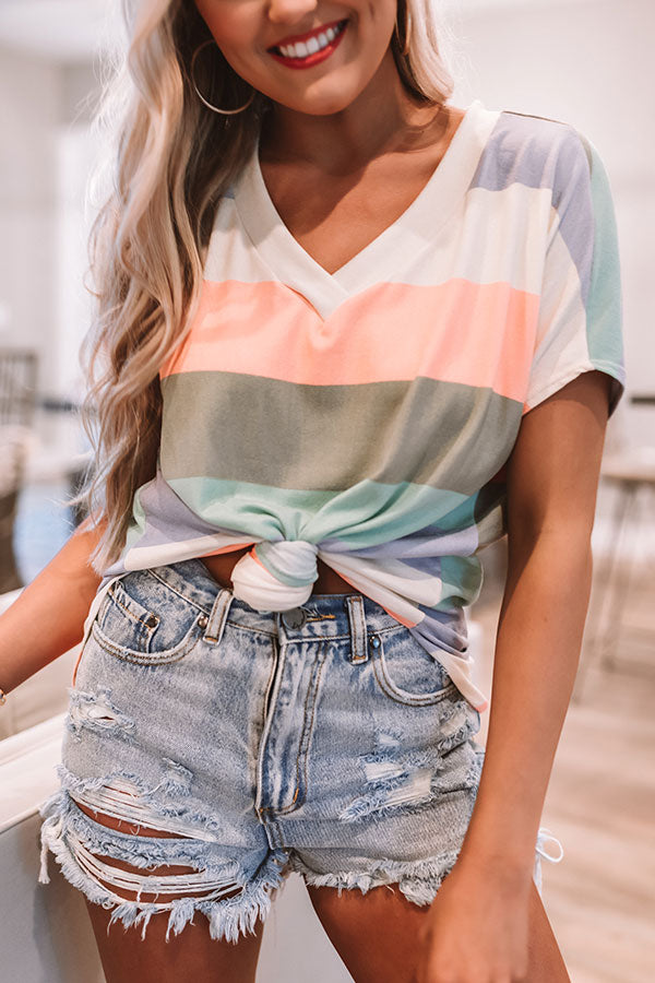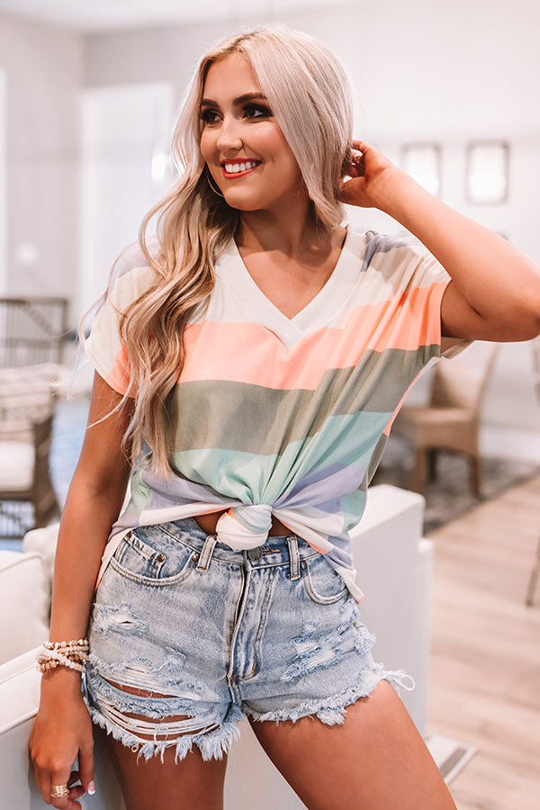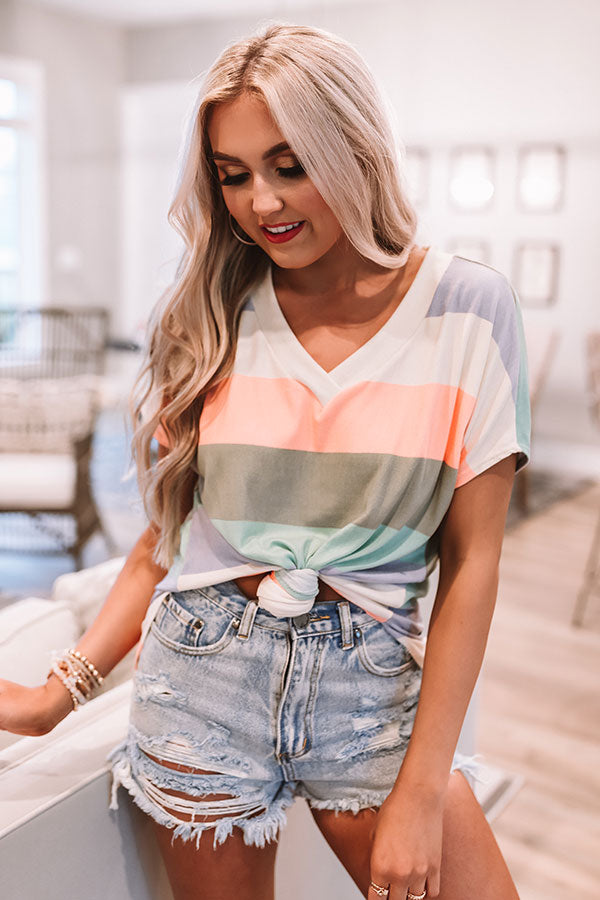 You won't have to start with a "clean fashion slate" after you wear this adorably casual top featuring soft lightweight material patterned with wide horizontal pastel accent stripes, a v-cut neckline, short loose sleeves, and a relaxed silhouette that falls into a rounded tunic length hemline that can be knotted! We have styled this versatile piece with some distressed denim shorts and trendy sneakers, but you can also wear it with some frayed white ankle skinnies, "The Melina Faux Leather Heel in Mint," and our "Had Me At Happy Hour Clutch!" Measurements