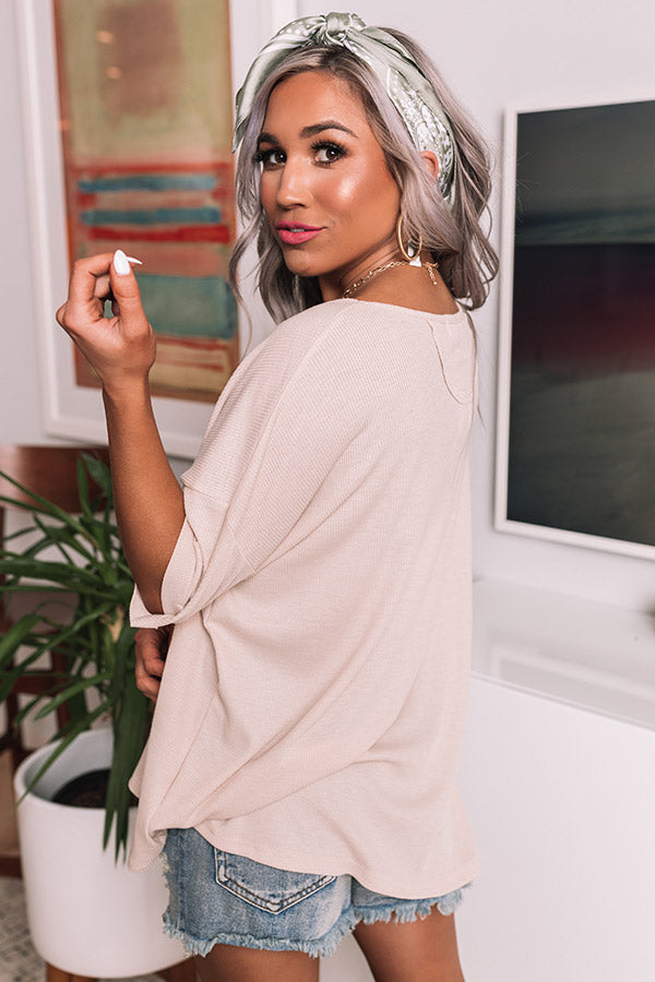 Keep your look simple but stylish with our timeless birch colored 'Clever Mind' top featuring soft lightweight material with waffle knit texturing, a wide neckline that can be worn off one side, short loose sleeves with rolled cuffs, a single accent chest pocket, exposed accent seams, and a slouched silhouette that ends in a rounded hemline! Measurements