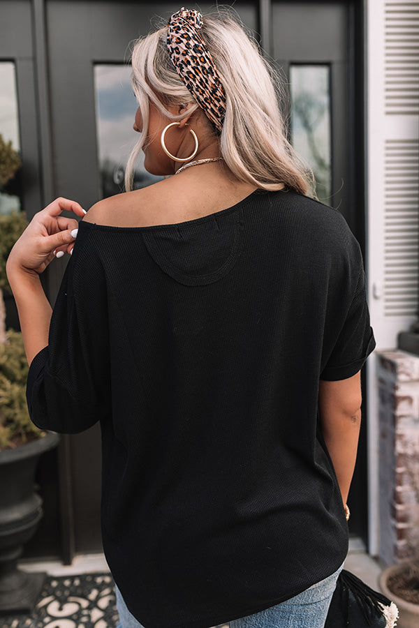 Keep your look simple but stylish with our timeless black 'Clever Mind' top featuring soft lightweight material with waffle knit texturing, a wide neckline that can be worn off one side, short loose sleeves with rolled cuffs, a single accent chest pocket, exposed accent seams, and a slouched silhouette that ends in a rounded hemline! Measurements