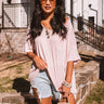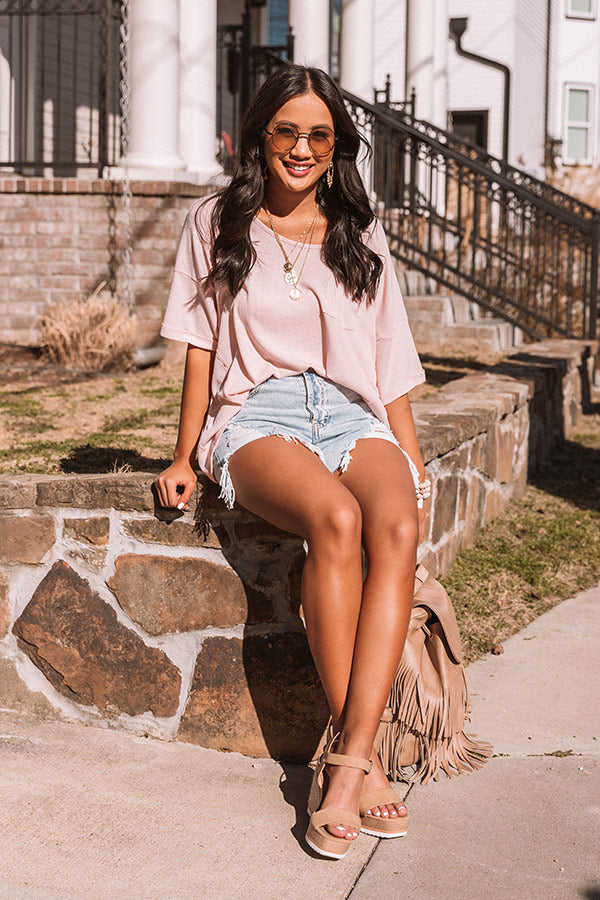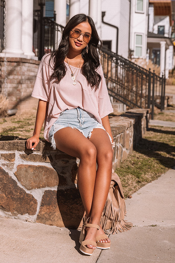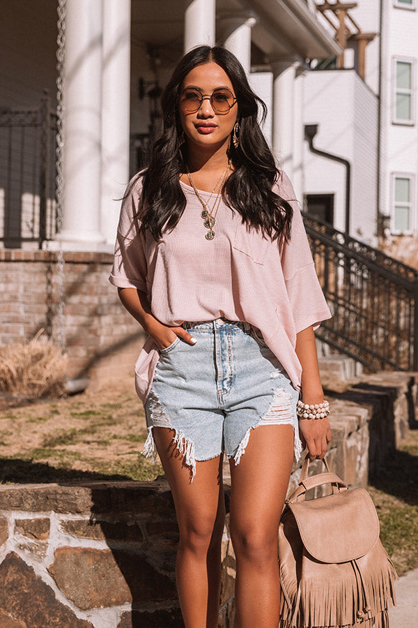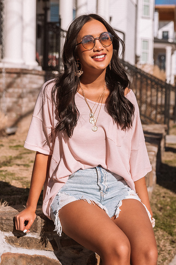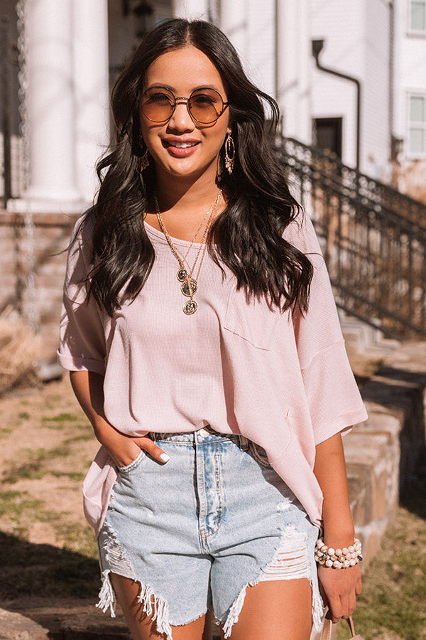 Keep your look simple but stylish with our timeless pink 'Clever Mind' top featuring soft lightweight material with waffle knit texturing, a wide neckline that can be worn off one side, short loose sleeves with rolled cuffs, a single accent chest pocket, exposed accent seams, and a slouched silhouette that ends in a rounded hemline! Measurements