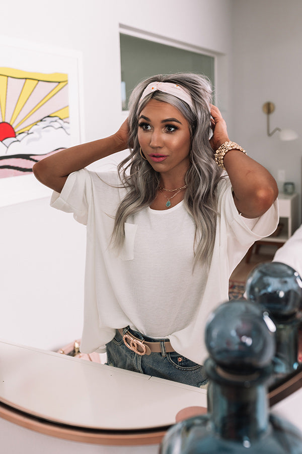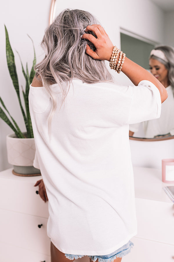 Keep your look simple but stylish with our timeless white 'Clever Mind' top featuring soft lightweight material with waffle knit texturing, a wide neckline that can be worn off one side, short loose sleeves with rolled cuffs, a single accent chest pocket, exposed accent seams, and a slouched silhouette that ends in a rounded hemline! Measurements