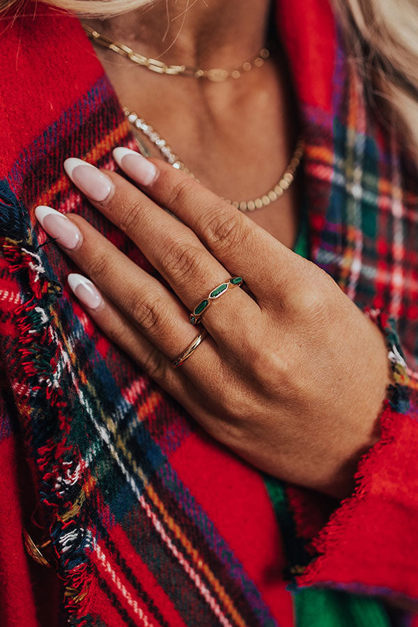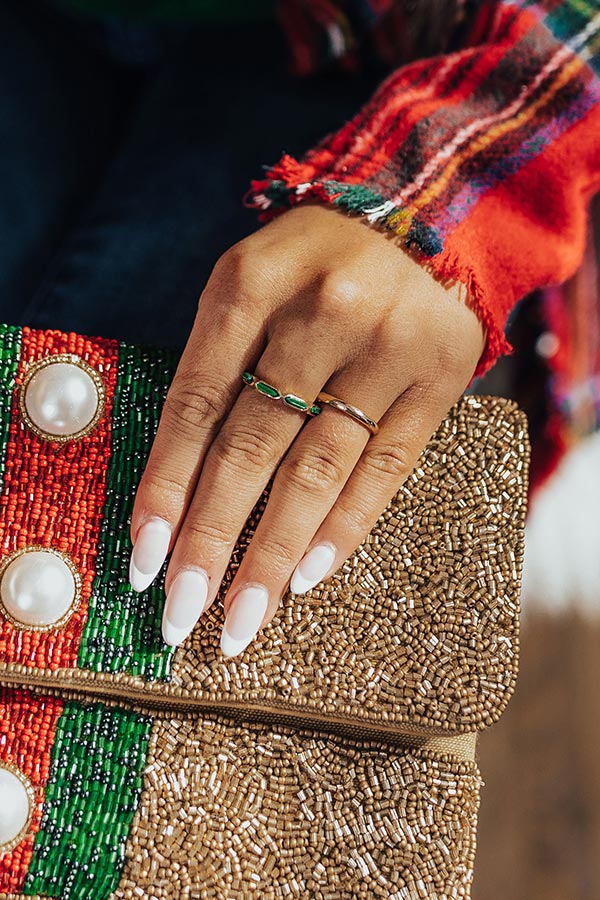 Take your holiday look to the next level with our luxe 'Clever Words' ring set featuring four pieces ranging from solid gold bands to beautiful emerald stones! This set's sizes vary from 6-7.