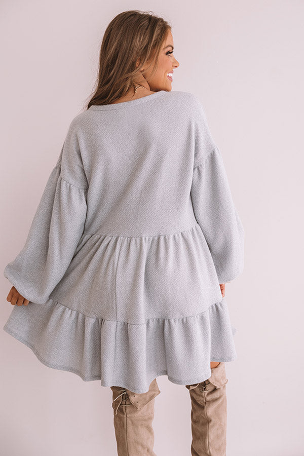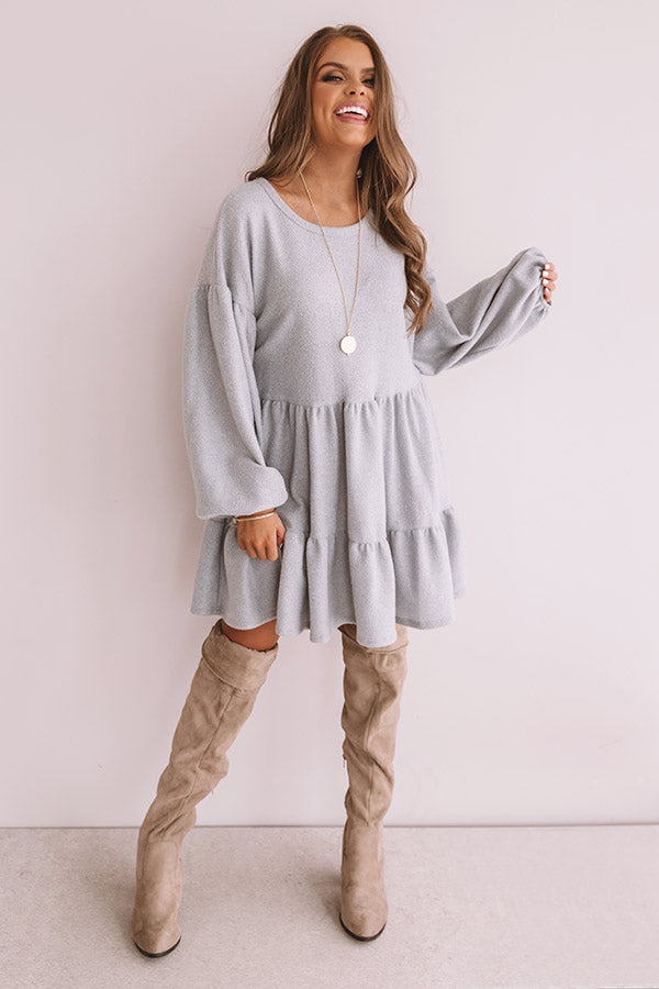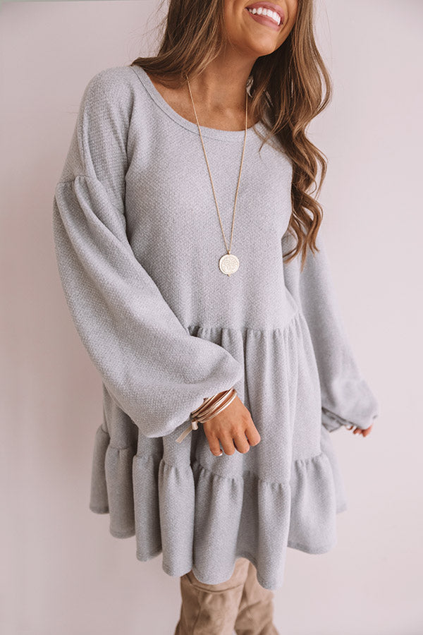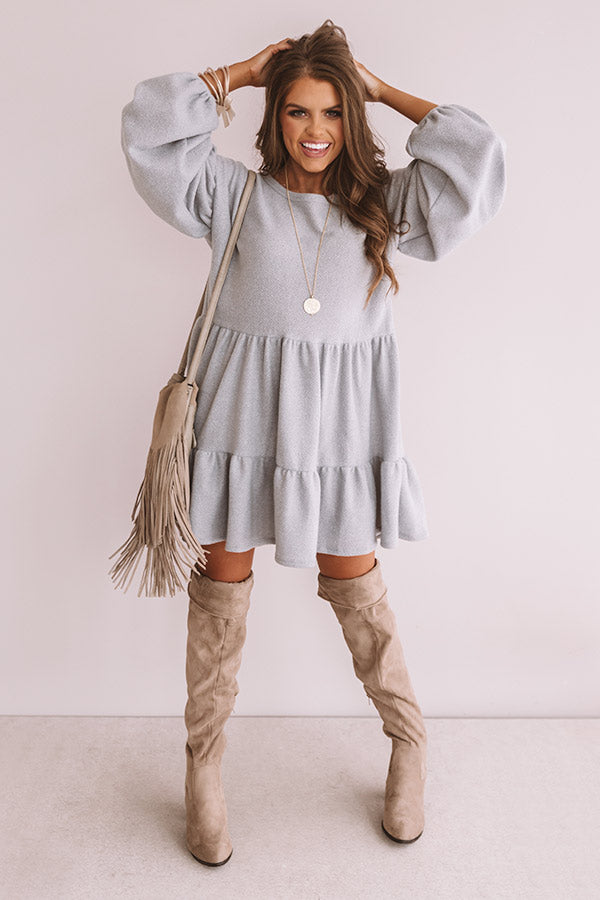 We have no doubt this airy blue colored shift dress will be "close to your heart" with its ultra soft and lightweight material, high rounded neckline, long oversized bishop sleeves with fitted elastic banded cuffs, and a relaxed tiered silhouette that falls into an uneven mid-thigh length hemline! This charming piece can be styled a variety of ways, like with a neutral over the knee boot and fringe crossbody, but you can also wear it with "The Seraphina Faux Leather Wedge in Grey" and our "All Caught Up Headband in Grey!" Measurements