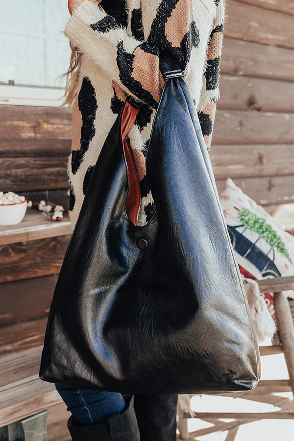 Up your street style with our gorgeous black 'Close To The City' tote featuring sleek faux leather material, a single handle, and a spacious triangle silhouette with additional inside pockets and a snap button closure!