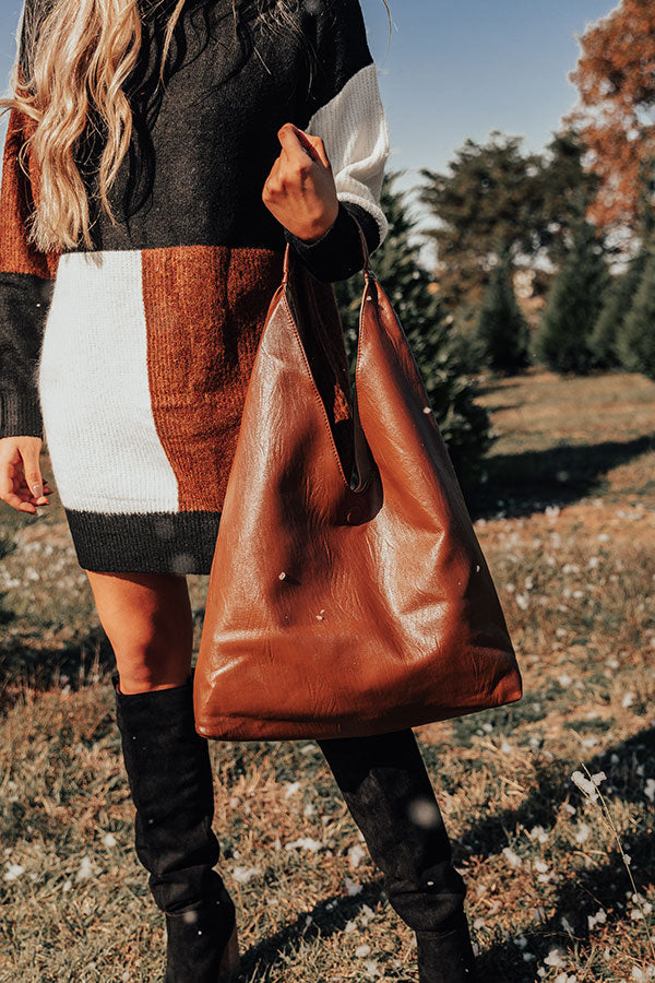 Up your street style with our gorgeous chocolate colored 'Close To The City' tote featuring sleek faux leather material, a single handle, and a spacious triangle silhouette with additional inside pockets and a snap button closure!
