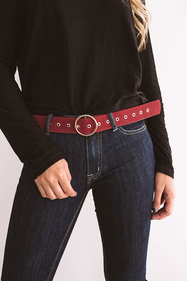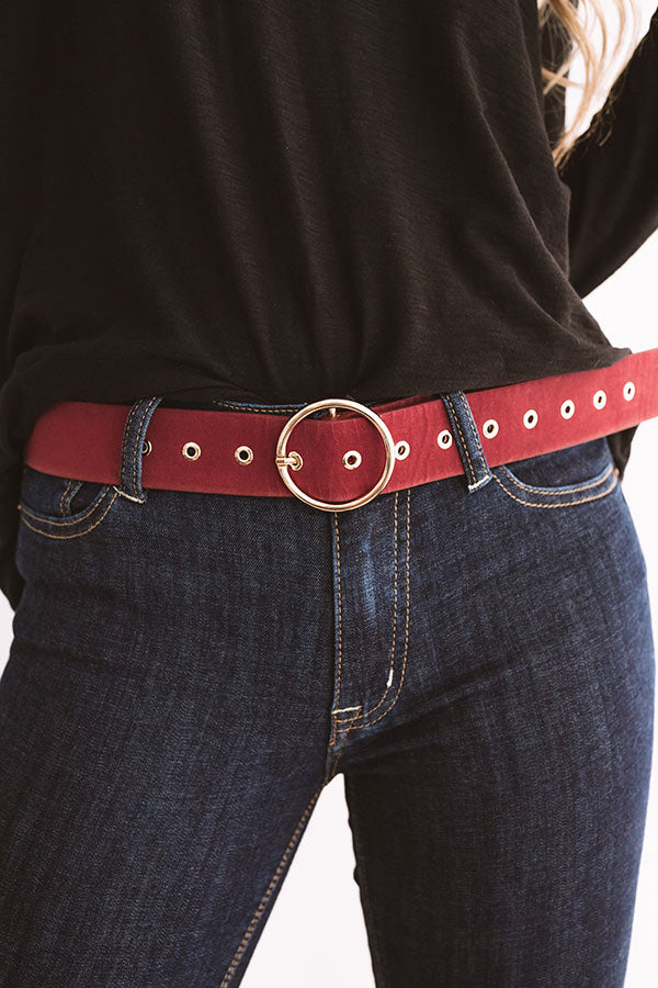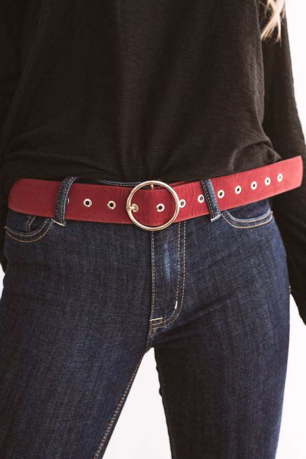 You will be "close up ready" when you wear this wine colored belt featuring a faux leather band with a gold circle buckle!
