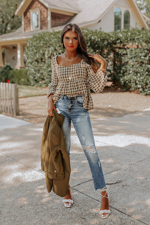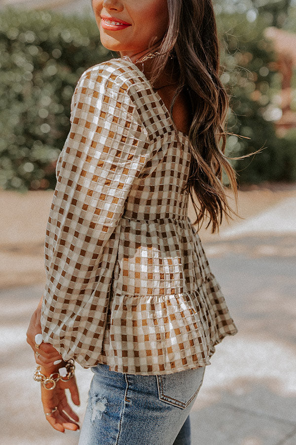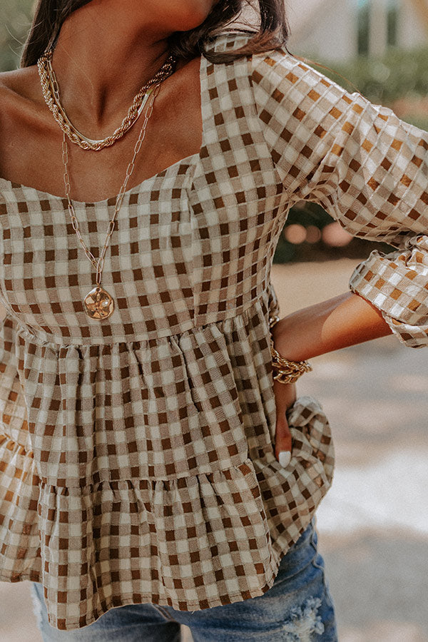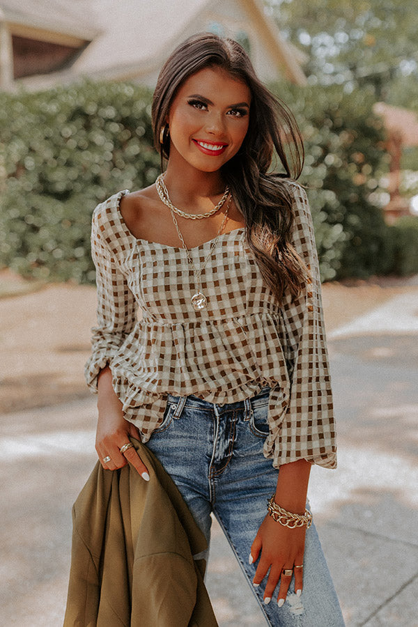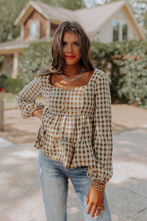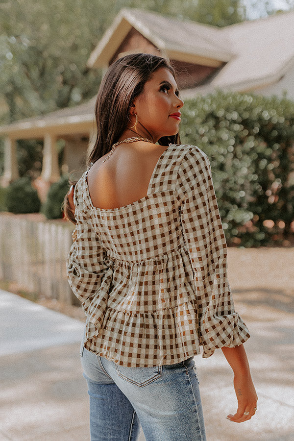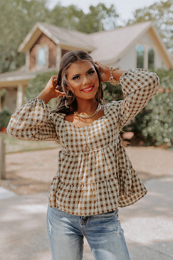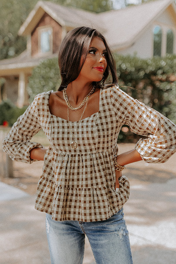 The perfect outfit is closer than ever with this charming top featuring lightweight material patterned with a brown and white checkered print, a flattering neckline, loose 3/4-length sleeves, and a babydoll silhouette that falls into a straight hemline!