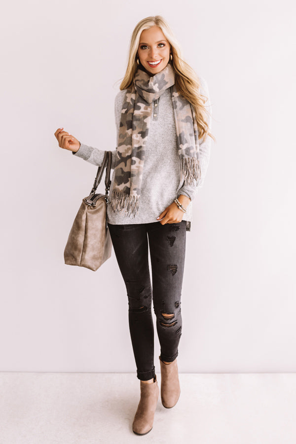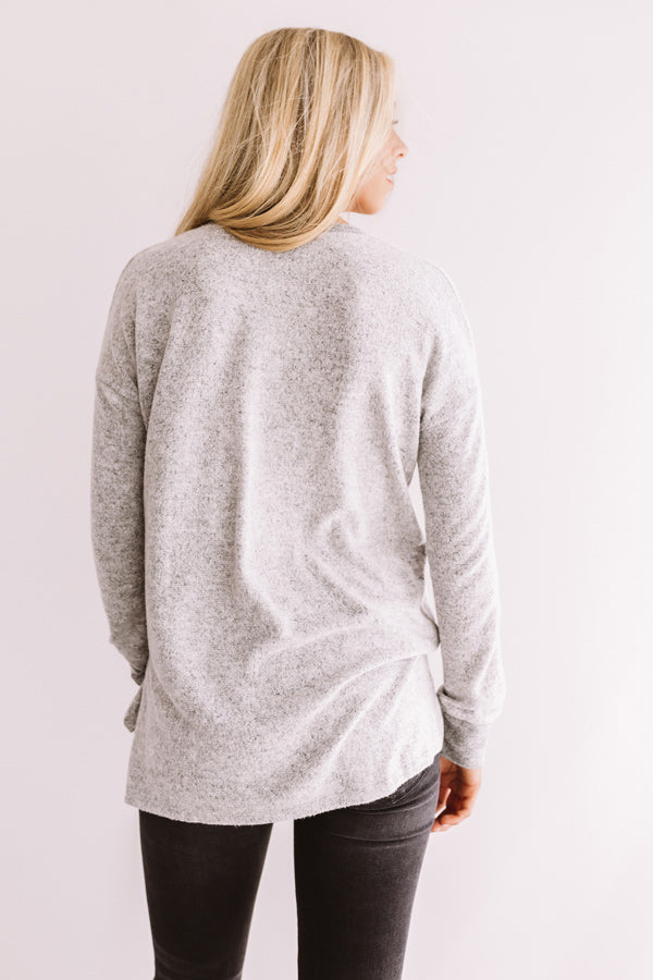 When headed for that "coastal cabin," keep warm with this grey henley top featuring a buttoned up bodice with a high rounded neckline, long sleeves with fitted cuffs, ultra soft lightweight material, and a straight fit silhouette that falls into a side split straight hemline! You can style this casual fall piece for a day out with some distressed black ankle skinnies, a camo scarf, and a neutral wedge and tote, or you can keep your look cozy when you wear it with our "Prosecco And Push Ups Midrise Legging" and "The Adrian Sneaker in Grey!" Measurements