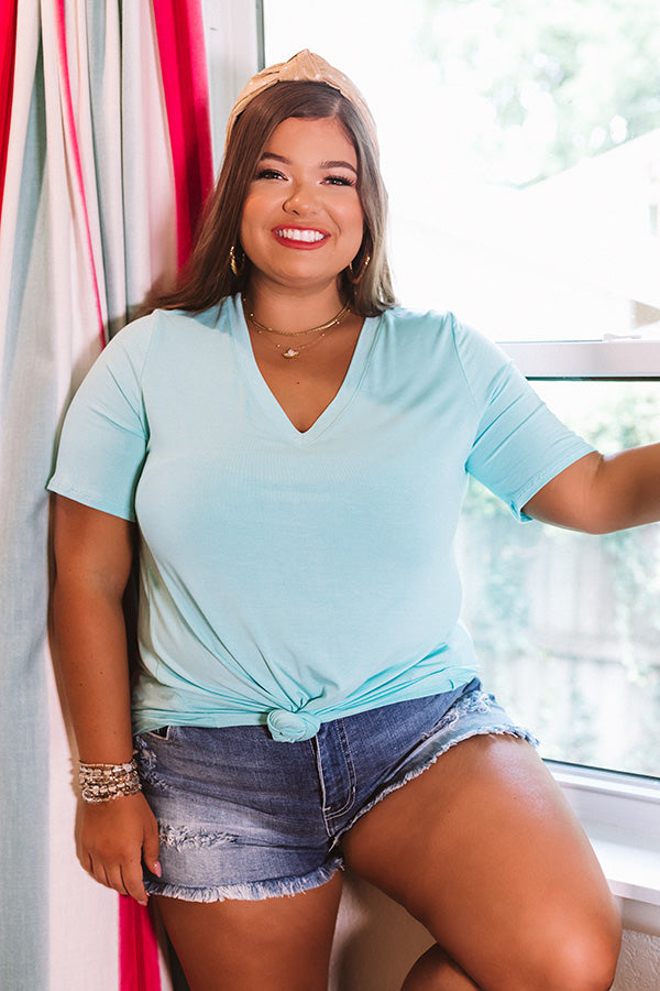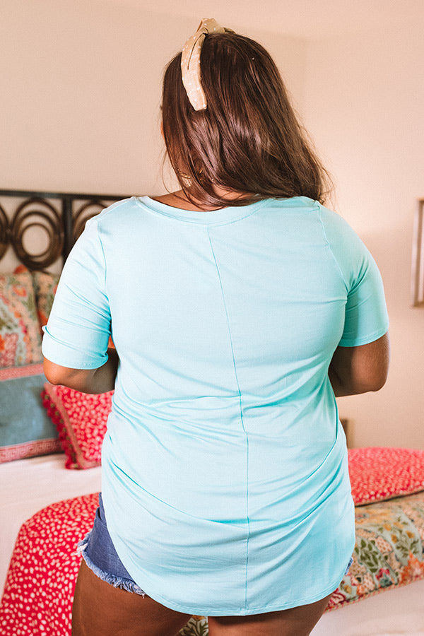 Plus Size - Stay looking chic on the coast with this basic aqua colored shift tee featuring soft lightweight material, a wide v-cut neckline that can be worn off one shoulder, short loose sleeves, and an ultra relaxed silhouette that falls into a rounded upper-thigh length hemline! You can style this casual piece a variety of ways, like with some denim shorts, a woven clutch, and a neutral wedge and headband, but you can also wear it with some white flares and "The Melina Faux Leather Heel in Mint!" Measurements