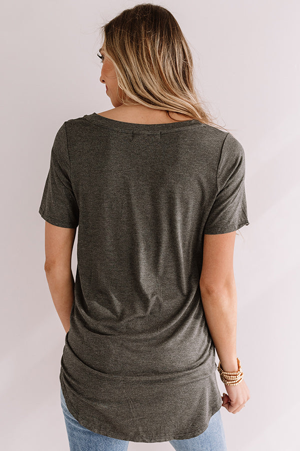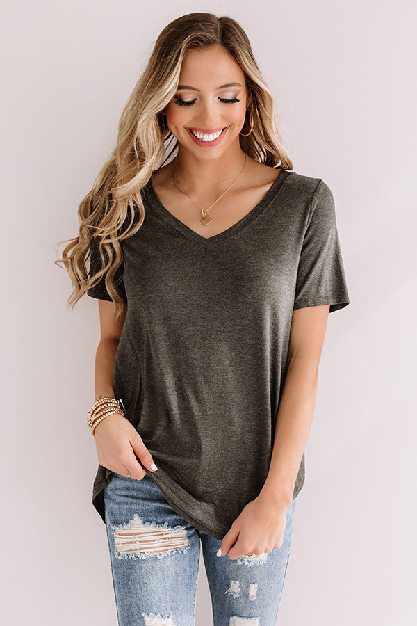 Stay looking chic on the coast with this basic charcoal colored shift tee featuring soft lightweight material, a wide v-cut neckline that can be worn off one shoulder, short loose sleeves, and an ultra relaxed silhouette that falls into a rounded upper-thigh length hemline! You can style this casual piece a variety of ways, like layered under a leopard jacket with some distressed ankle skinnies and a neutral heel and tote, but you can also wear it solo with some frayed white shorts, "The Charlotte Espadrille in Yellow," and our "Say It Ain't Soho Hat in Marigold!" Measurements