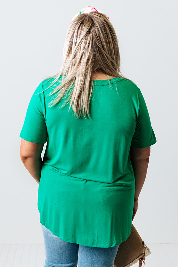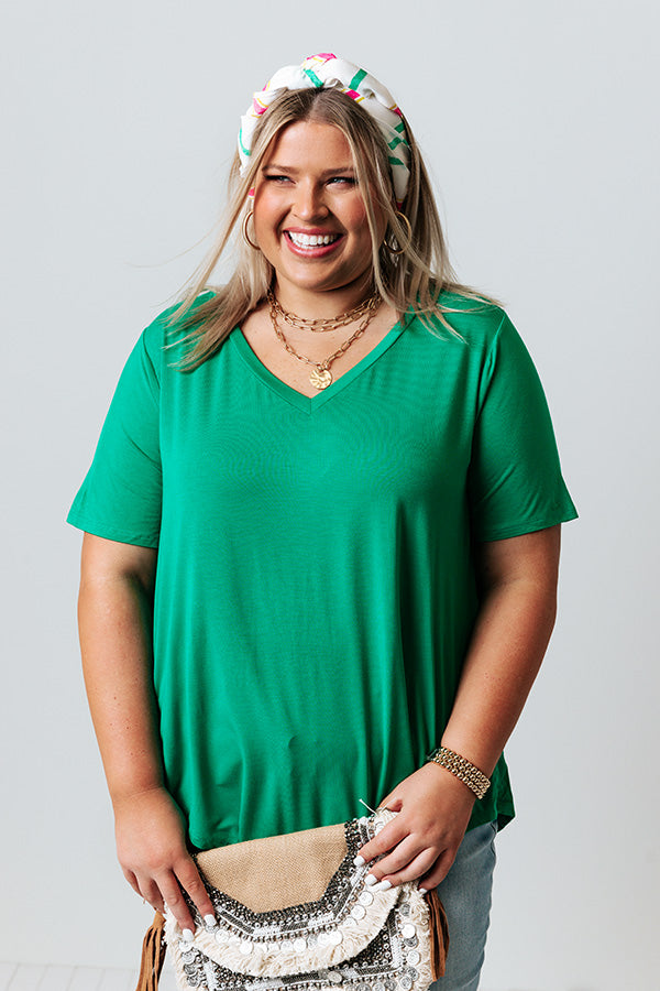 Plus Size - Stay looking chic on the coast with this basic emerald colored shift tee featuring soft lightweight material, a wide v-cut neckline that can be worn off one shoulder, short loose sleeves, and an ultra relaxed silhouette that falls into a rounded upper-thigh length hemline! Measurements