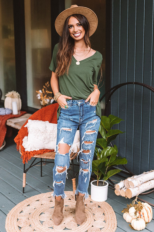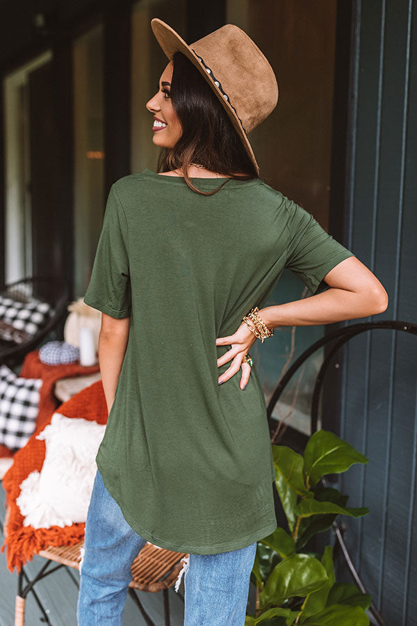 Stay looking chic year round with this basic olive colored shift tee featuring soft lightweight material, a wide v-cut neckline that can be worn off one shoulder, short loose sleeves, and an ultra relaxed silhouette that falls into a rounded upper-thigh length hemline! Measurements
