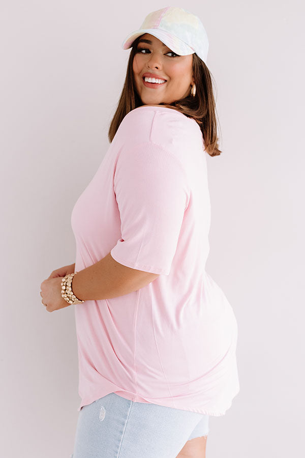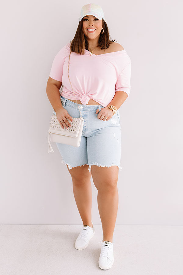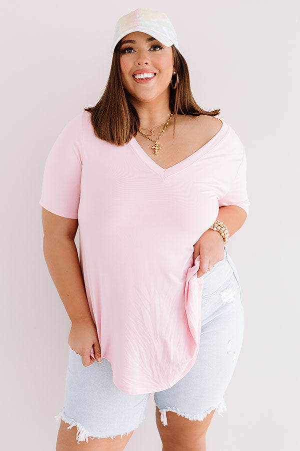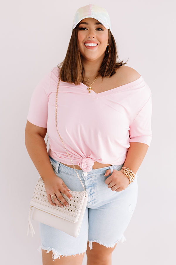 Plus Size - Stay looking chic on the coast with this basic pink shift tee featuring soft lightweight material, a wide v-cut neckline that can be worn off one shoulder, short loose sleeves, and an ultra relaxed silhouette that falls into a rounded upper-thigh length hemline! You can style this casual piece a variety of ways, like with some light wash shorts and a white trendy sneaker, crossbody, and baseball cap, but you can also wear it with "The Cosmo High Waist Joggers in Khaki" and "The Mara Sandal in Pink!" Measurements