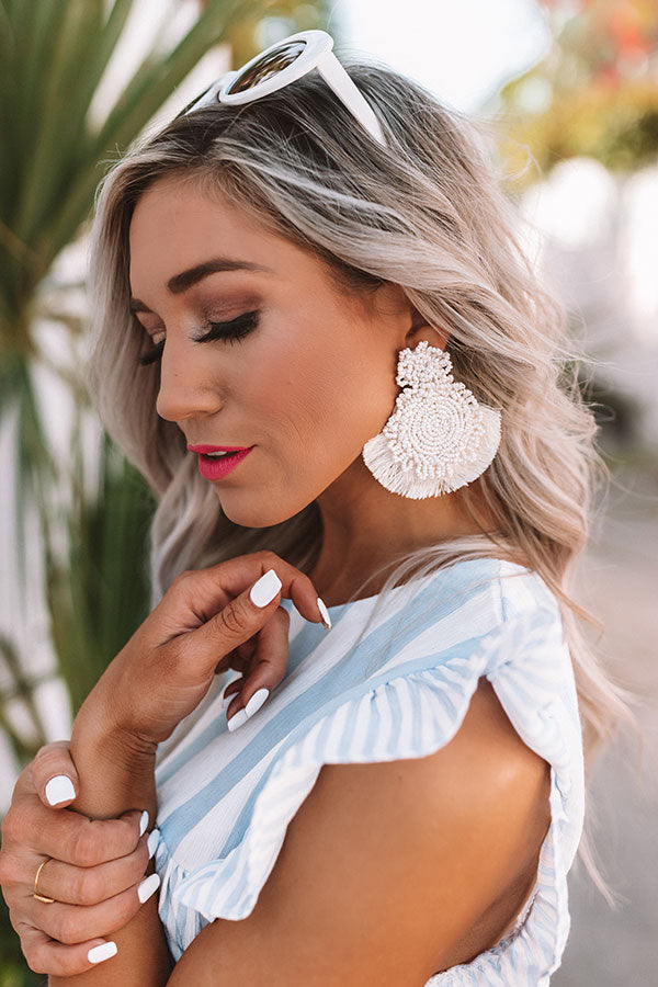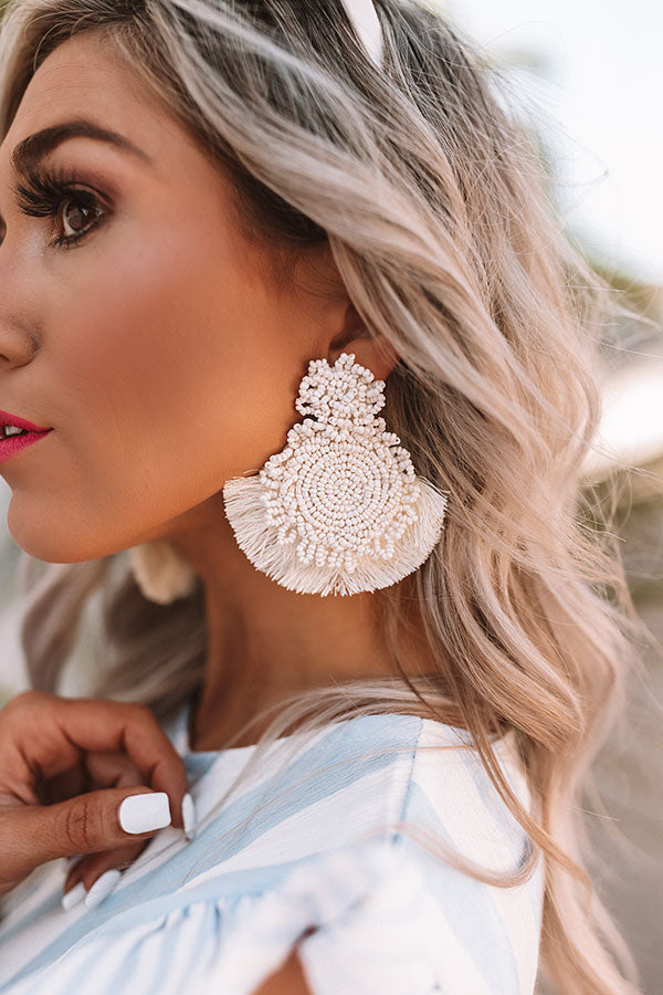 Everyone will undoubtedly be crushing on you when you accessorize with these adorable ivory colored statement earrings featuring beaded studs and circle pendants with fringe fans!