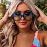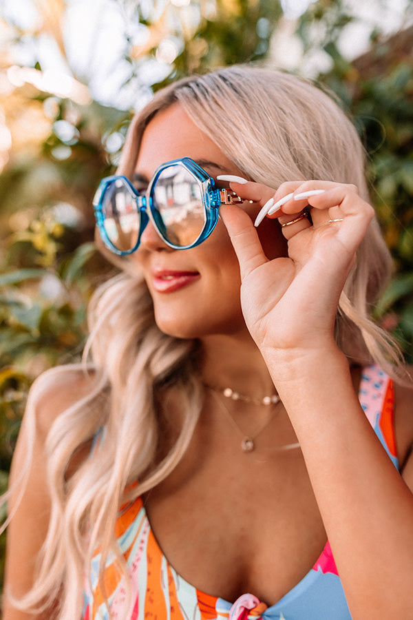 Stay shady luxuriously in our upscale 'Coastal Jam Sunnies' featuring oversized blue geometric frames with gold ear pieces and dark tinted lenses!